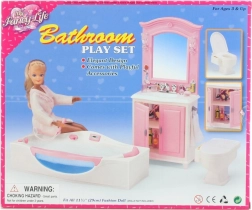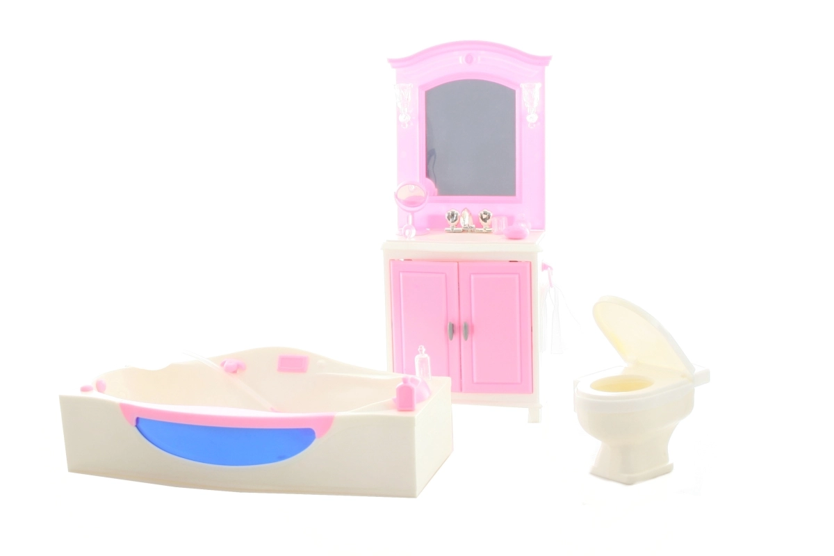 Ofrece a los juegos infantiles un equipamiento realista con el set de baño Glorie. El set incluye un tocador con lavabo, una bañera y un inodoro en tamaño infantil, complementados con accesorios prácticos como cosméticos, jabón y toalla. Fabricado en plástico resistente, apto para niños a partir de 3 años. La muñeca no está incluida.