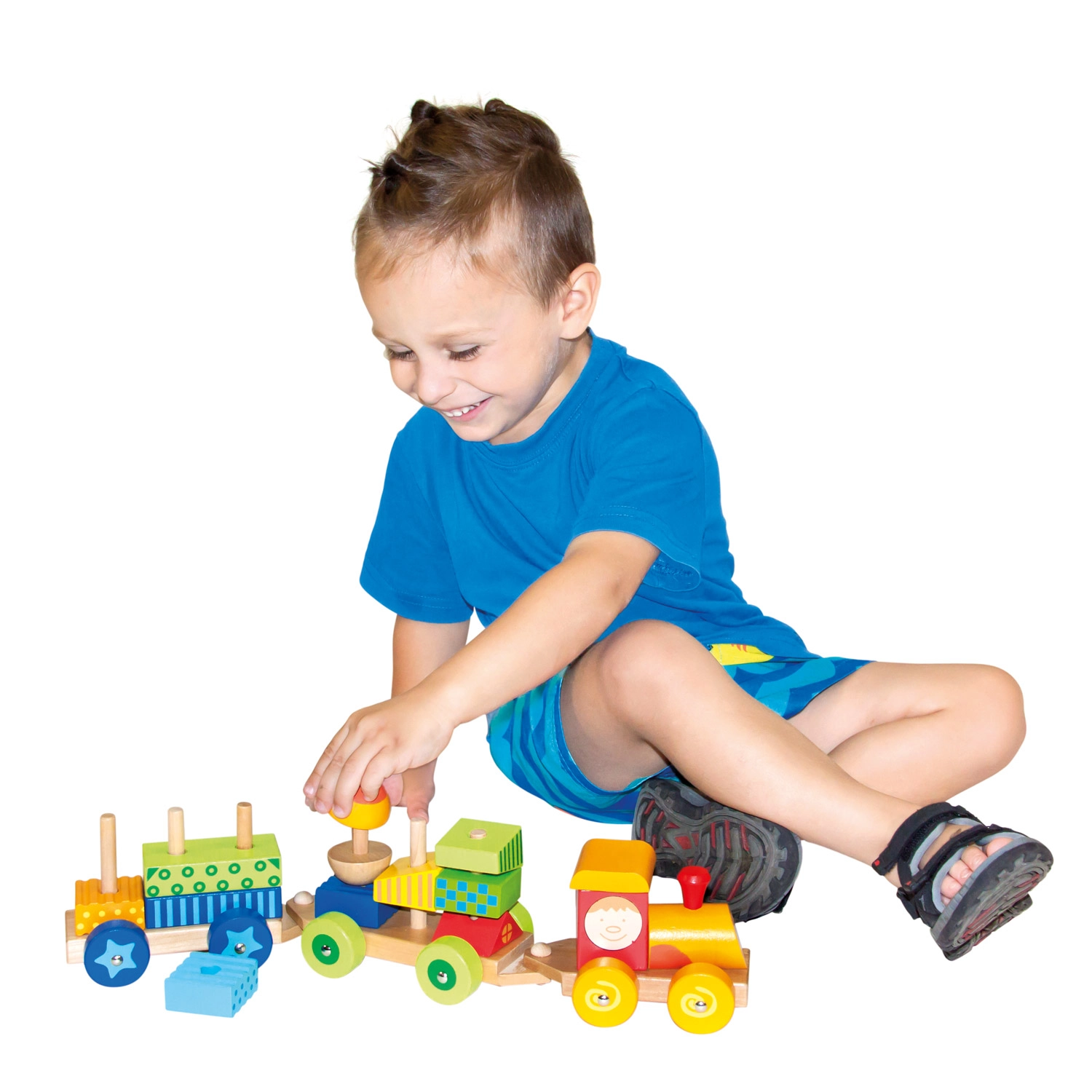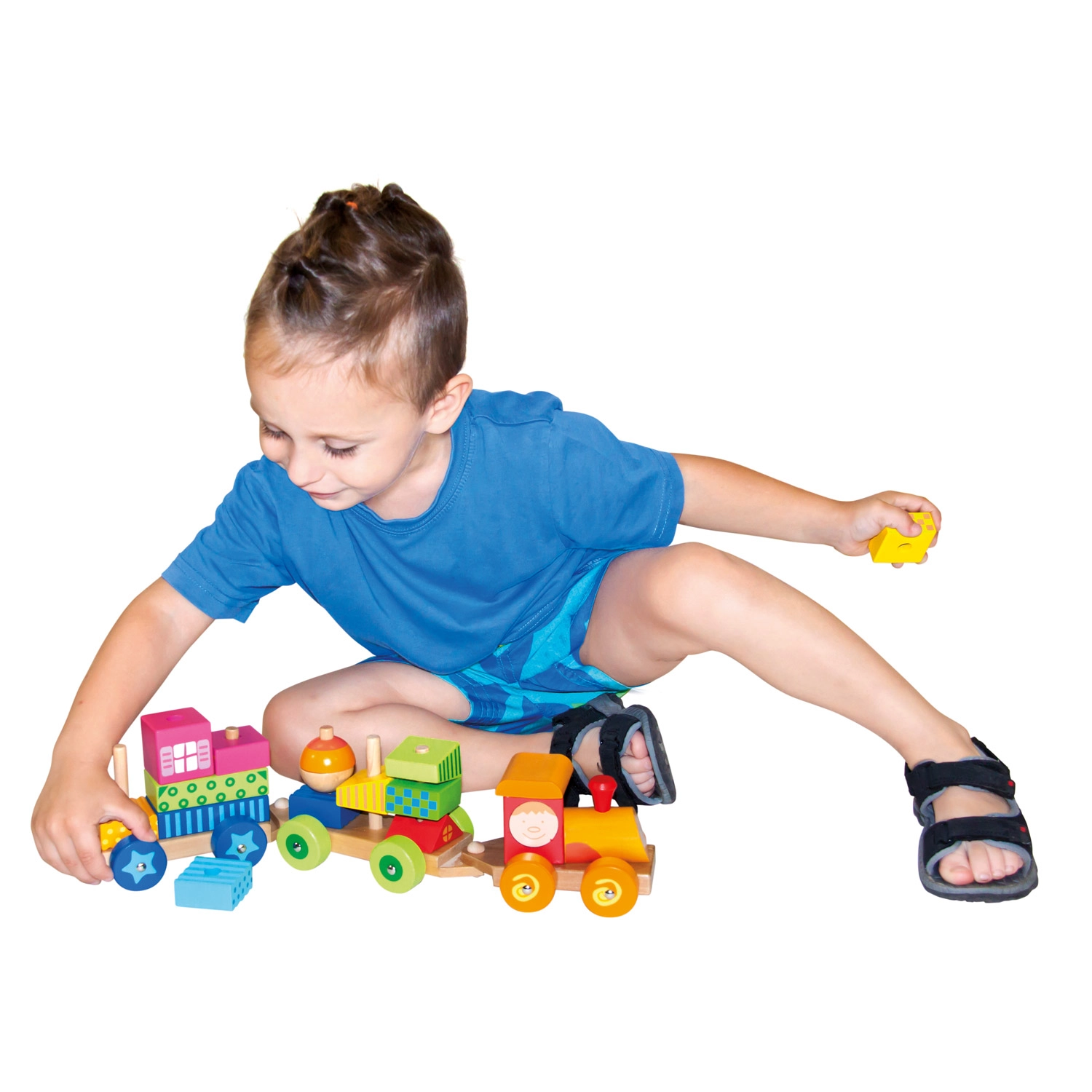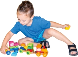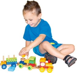 Este tren de madera multifuncional no solo es un juguete de arrastre, sino también un set de construcción que permite a los niños desarrollar su creatividad. El tren incluye tres chasis y 18 bloques diferentes que se pueden apilar según la imaginación.
