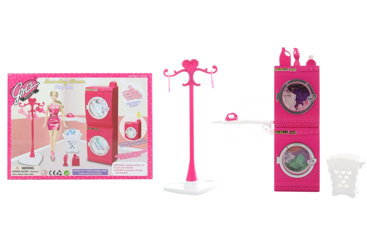 Brinda a los niños un juego realista con el completo set Glorie lavandería. El set incluye una lavadora que gira al presionar el botón, secadora, tabla de planchar, perchero, cesto para la ropa y perchas. Complemento ideal para casas de muñecas a partir de 3 años.