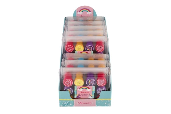 Presentamos un divertido set de sellos autoentintables con motivos de unicornios: ideal para las creaciones infantiles en casa, en la escuela y en fiestas. Cada sello está listo para usarse de inmediato, sin desorden ni necesidad de una almohadilla extra: basta con abrir la tapa y estampar.