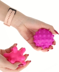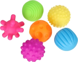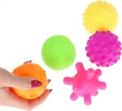 Las pelotas son aptas para jugar en seco y en el agua. Las texturas son ideales para un suave masaje de manos y pies y aportan calma.