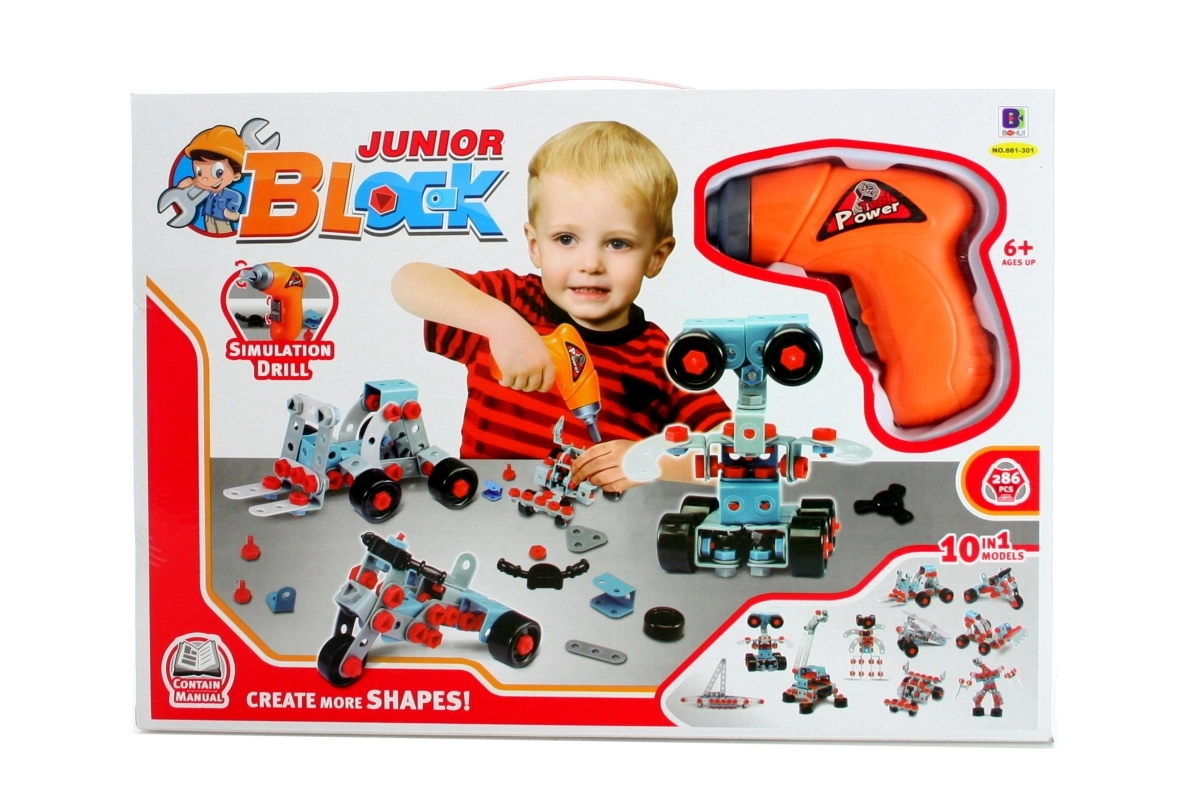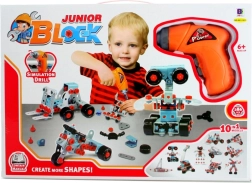 Desarrolla la creatividad y la motricidad fina con el versátil set de construcción Junior Block. El conjunto incluye 286 piezas, entre ellas un taladro inalámbrico simulado, y permite a los niños a partir de 6 años construir hasta 10 modelos diferentes de vehículos, robots y otras estructuras. Presentación práctica (aprox. 41 × 29 × 6 cm) y atornillado sencillo con tornillos y tuercas de plástico para horas de diversión. El taladro funciona con 2× pilas AA (no incluidas).