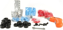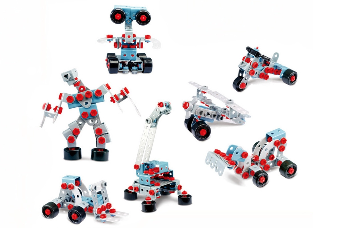 Vigas modulares, conectores, ruedas y tornillos permiten reconstrucciones repetidas. Ideal para desarrollar la motricidad fina y el pensamiento técnico.