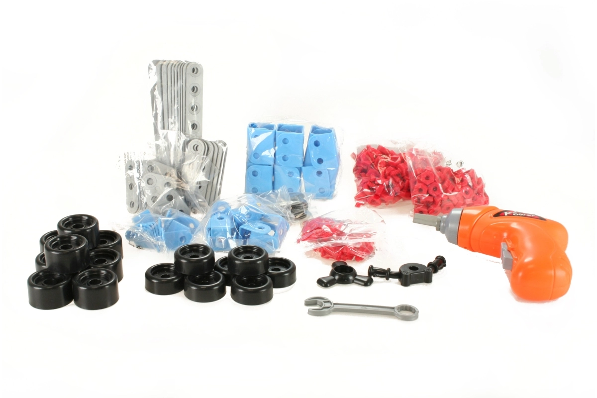 - Piezas de plástico, ruedas, tornillos y tuercas, taladro inalámbrico simulado, manual