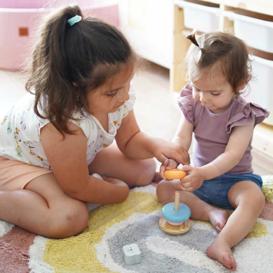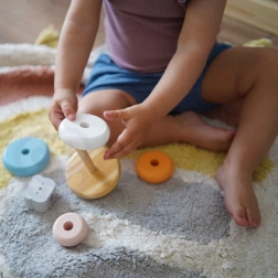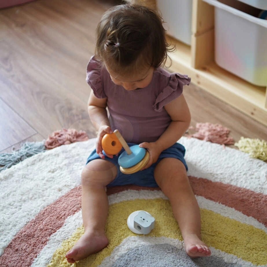 Encajar los anillos en la base no solo aporta alegría a los niños, sino que también desarrolla su coordinación y su pensamiento lógico. Además, aprenden a reconocer colores y a trabajar con diferentes formas.