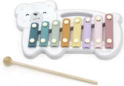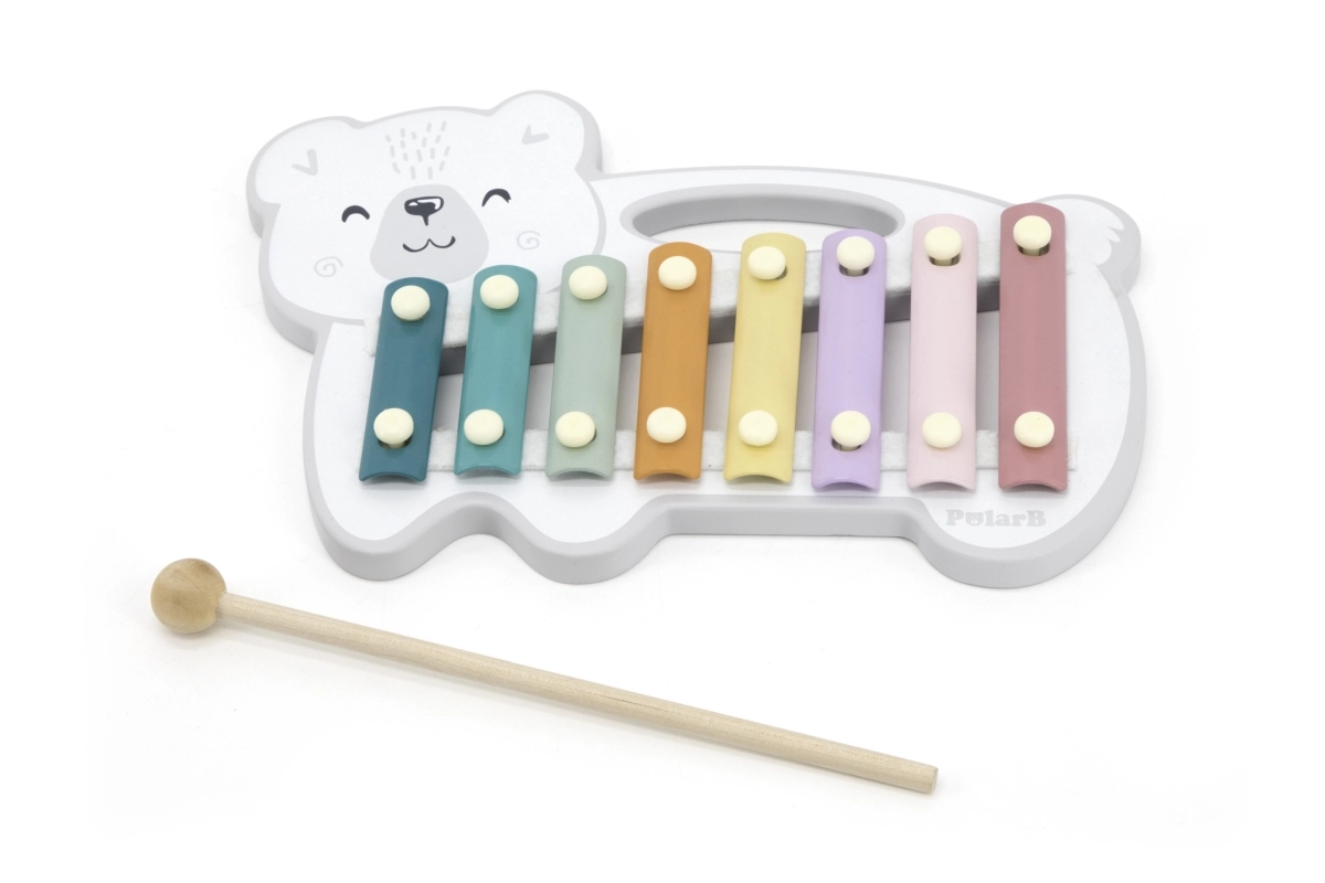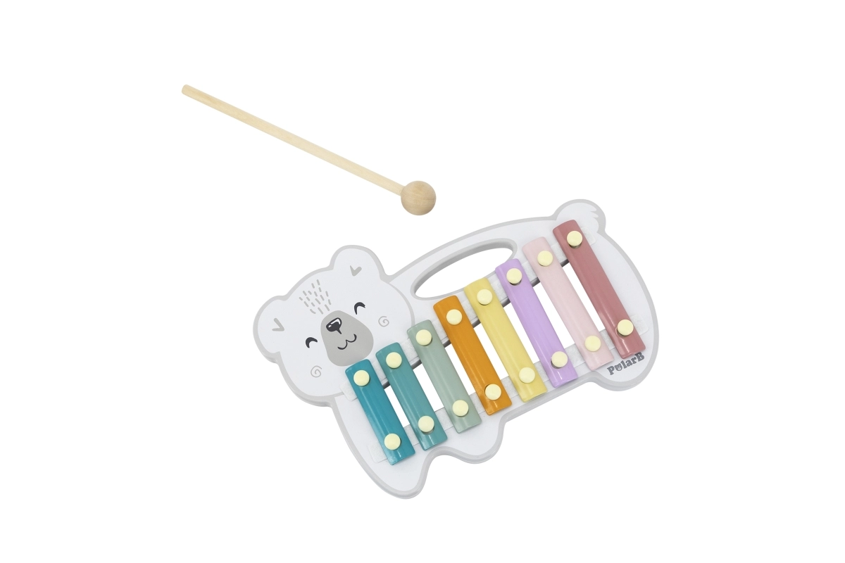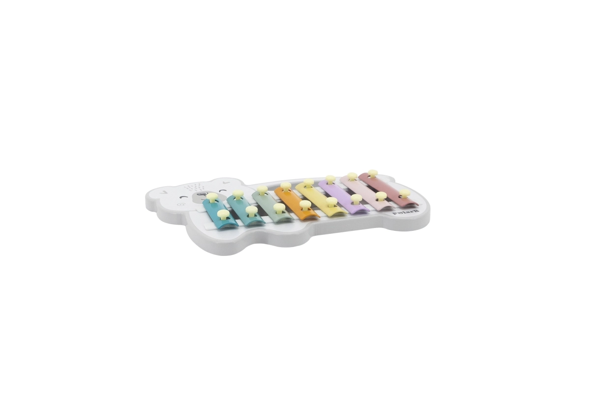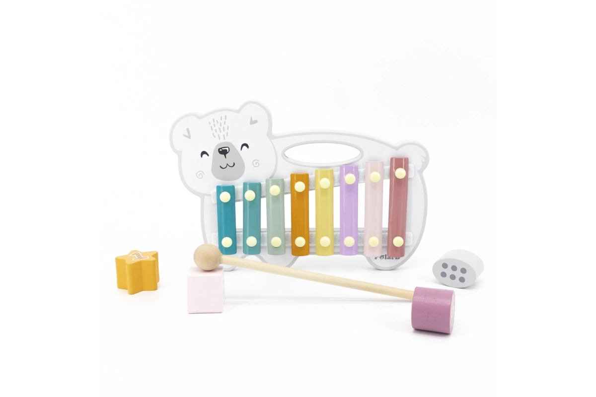 El xilófono de madera con forma de oso polar combina una estética lúdica con un instrumento musical funcional. Las láminas metálicas en colores pastel producen tonos agradables al golpear con la baqueta de madera, motivando de forma natural a los niños a experimentar con sonidos y ritmo.