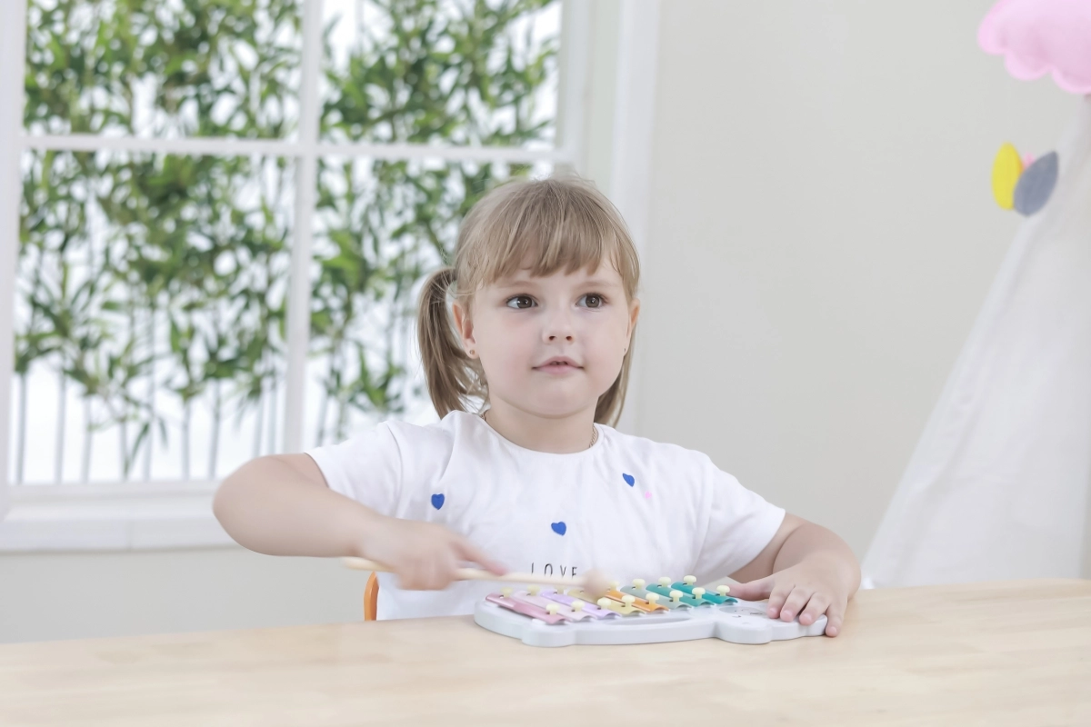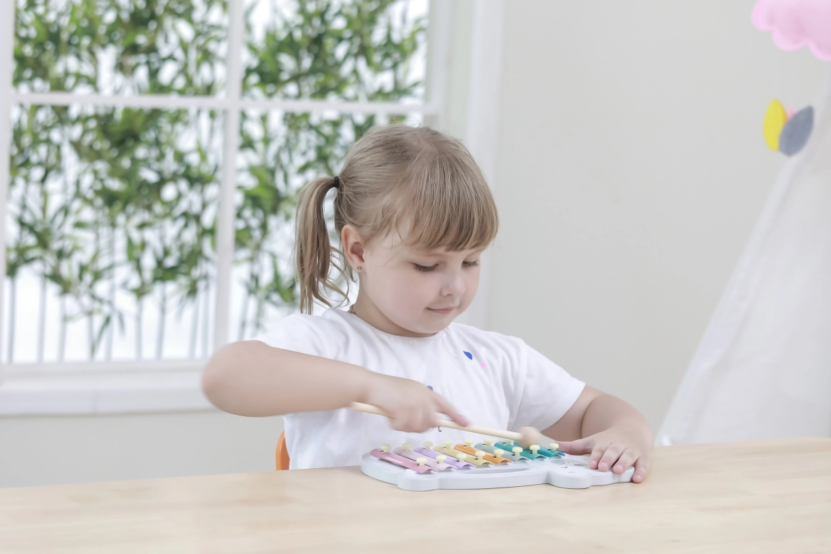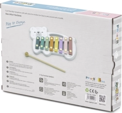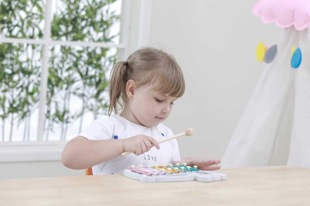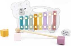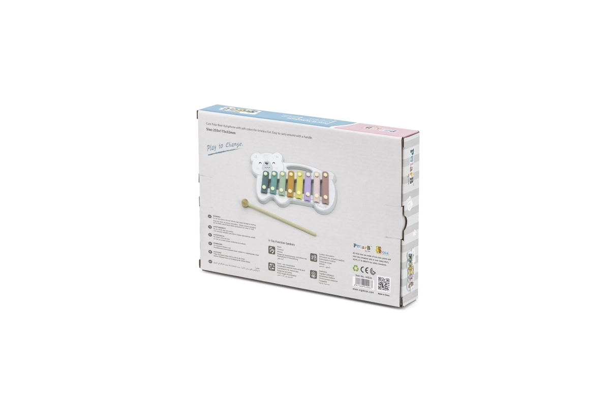 El xilófono de madera con forma de oso polar combina una estética lúdica con un instrumento musical funcional. Las láminas metálicas en colores pastel producen tonos agradables al golpear con la baqueta de madera, motivando de forma natural a los niños a experimentar con sonidos y ritmo.