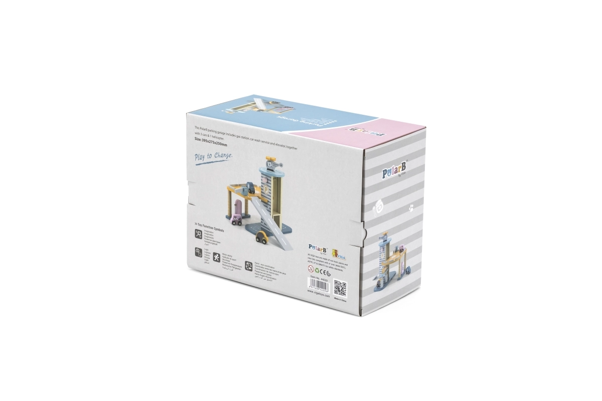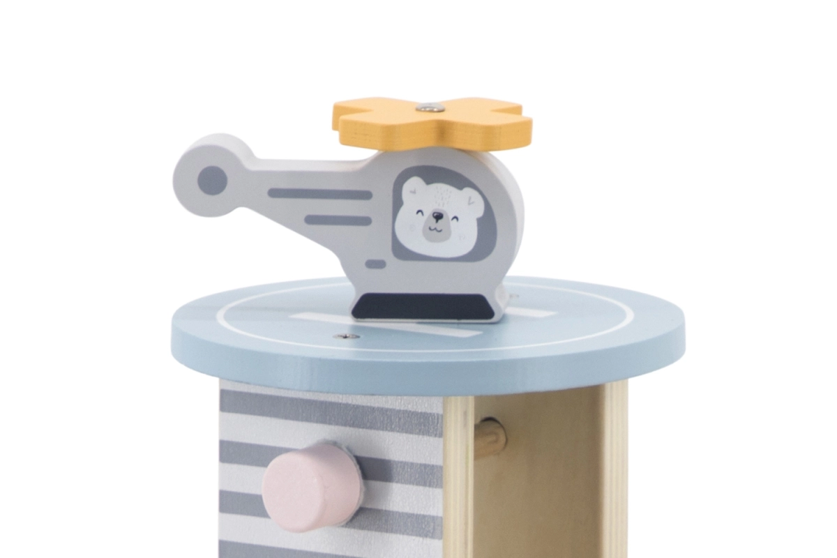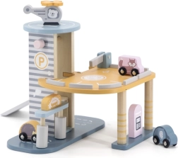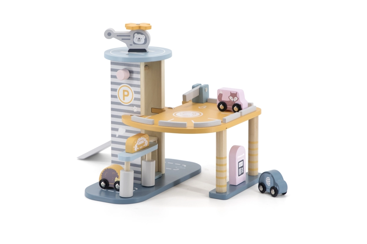 El garaje de madera con helicóptero y coches es un juguete fantástico que apoya la creatividad y el desarrollo de las habilidades motoras de los niños. Este juguete interactivo está equipado con lavadero de coches, gasolinera y ascensor. El set incluye tres cochecitos y un helicóptero, todo en colores suaves que combinan con cualquier habitación infantil.