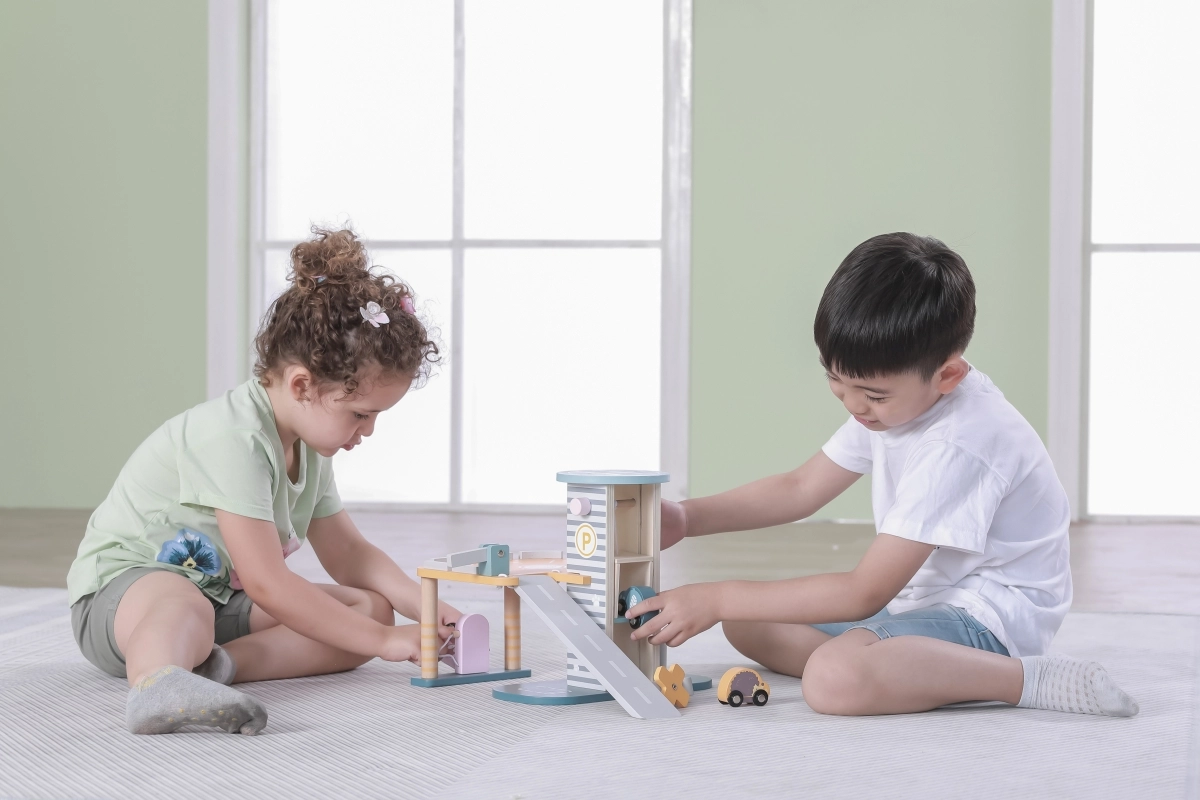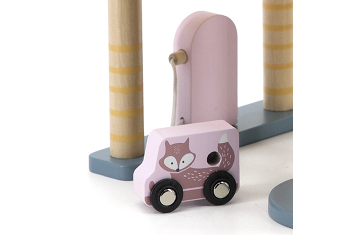 El garaje de madera ofrece muchas posibilidades de juego interactivo gracias a funciones integradas como el lavadero, la gasolinera y el ascensor.