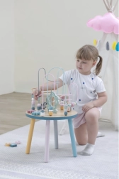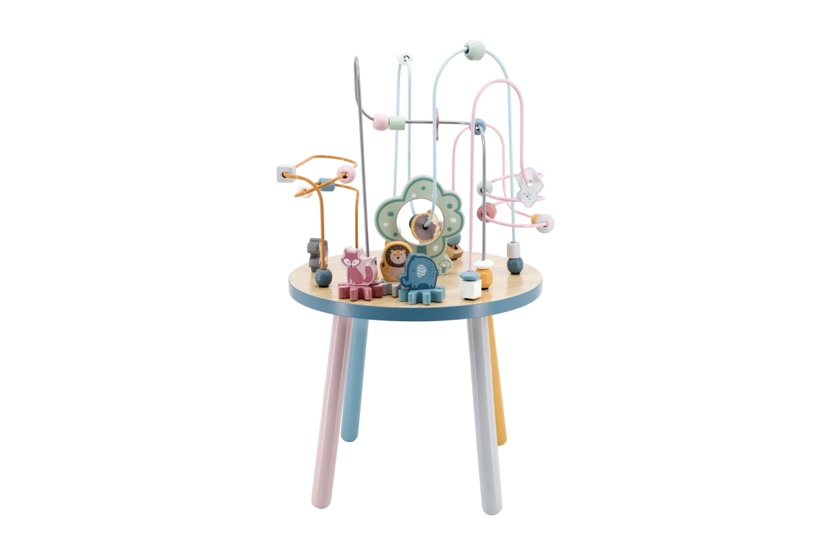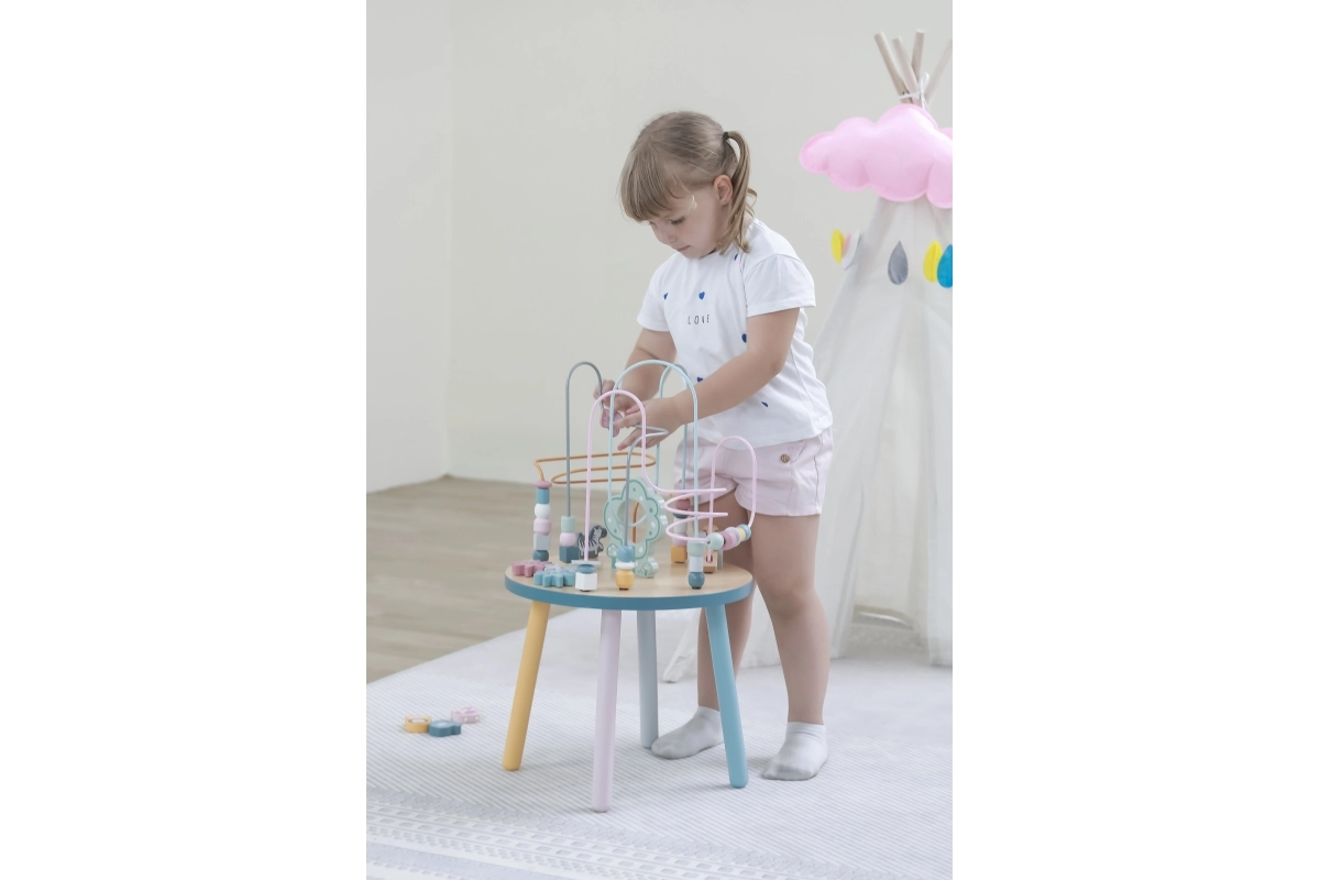 El laberinto de cuentas sobre la resistente mesa de madera invita a los niños a explorar. Las formas de colores y los adorables animalitos (osito, zorro, erizo) motivan el movimiento de los deditos, el agarre preciso y la creación de historias propias. Una elección ideal para un enfoque “Montessori” en casa, aprendiendo a través del juego que desarrolla paciencia, concentración e imaginación.