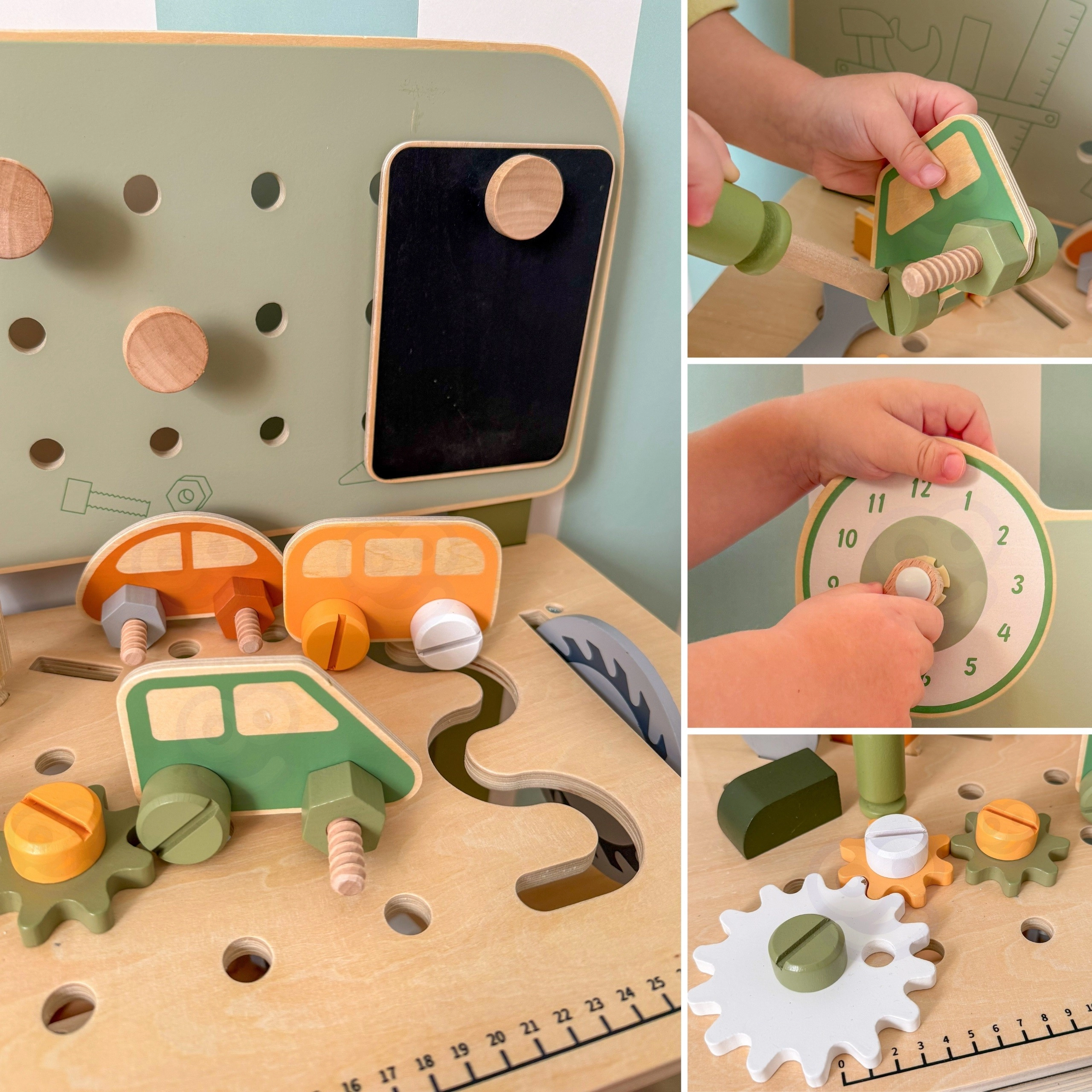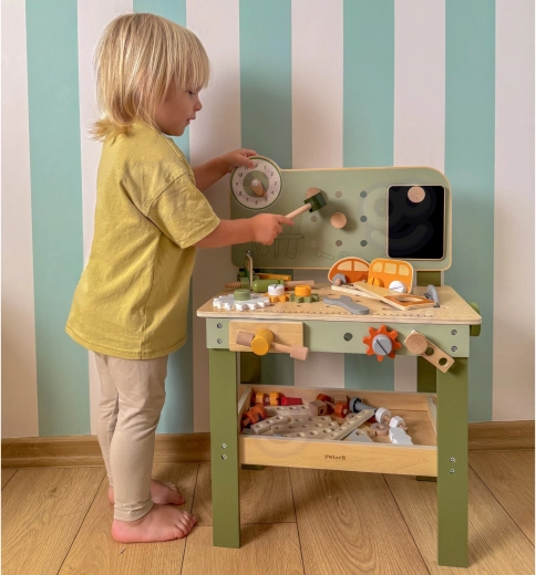 Incluye un set de herramientas (martillo, llave, destornillador), tornillos, tuercas y engranajes, panel con reloj educativo y una práctica repisa para dejar objetos. Los niños pueden montar sus propias creaciones, “reparar” y clasificar piezas: ideal para desarrollar la creatividad, la paciencia y la planificación.