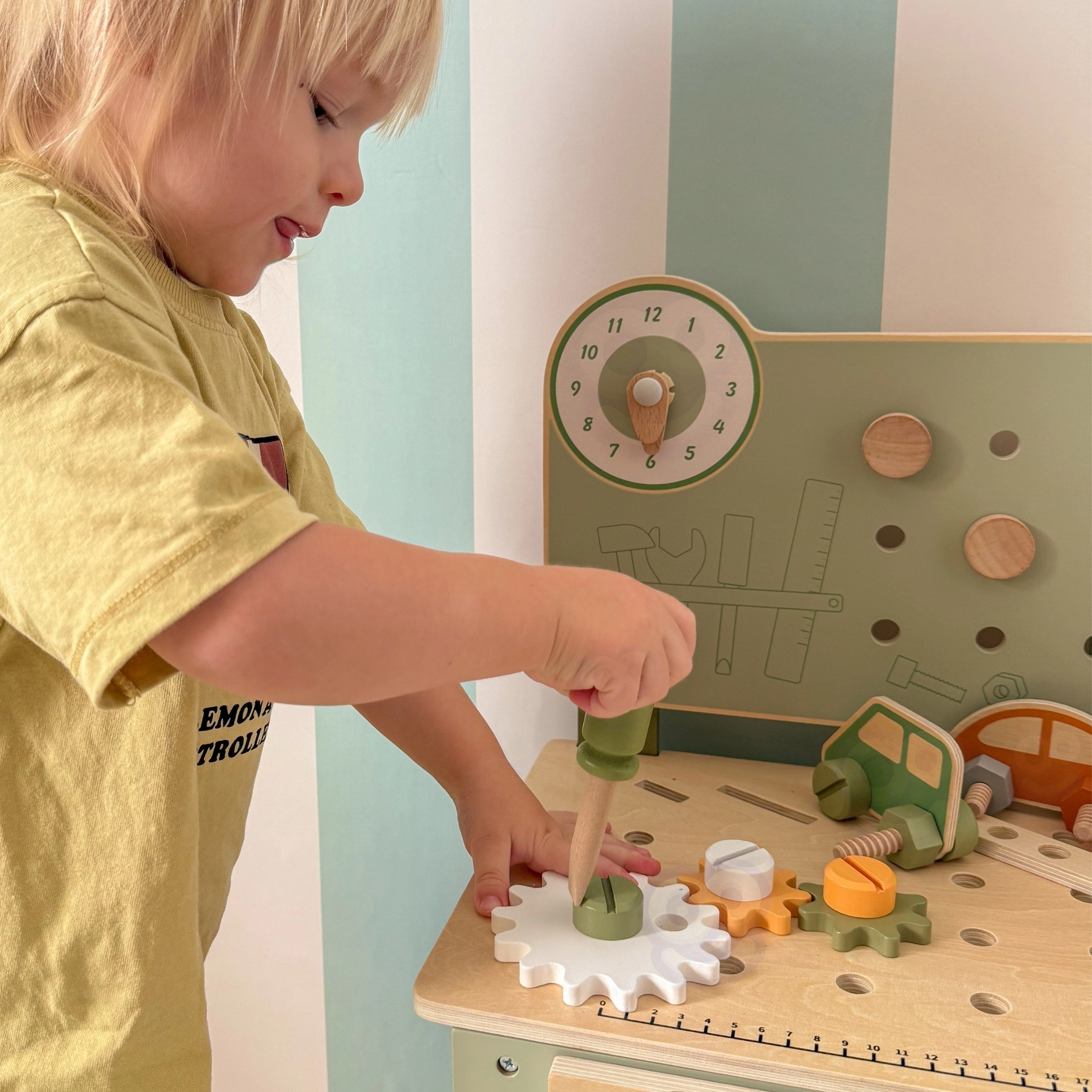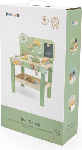El banco con panel perforado, escala de medición y elementos giratorios fomenta el juego realista y el desarrollo de habilidades al trabajar con herramientas.