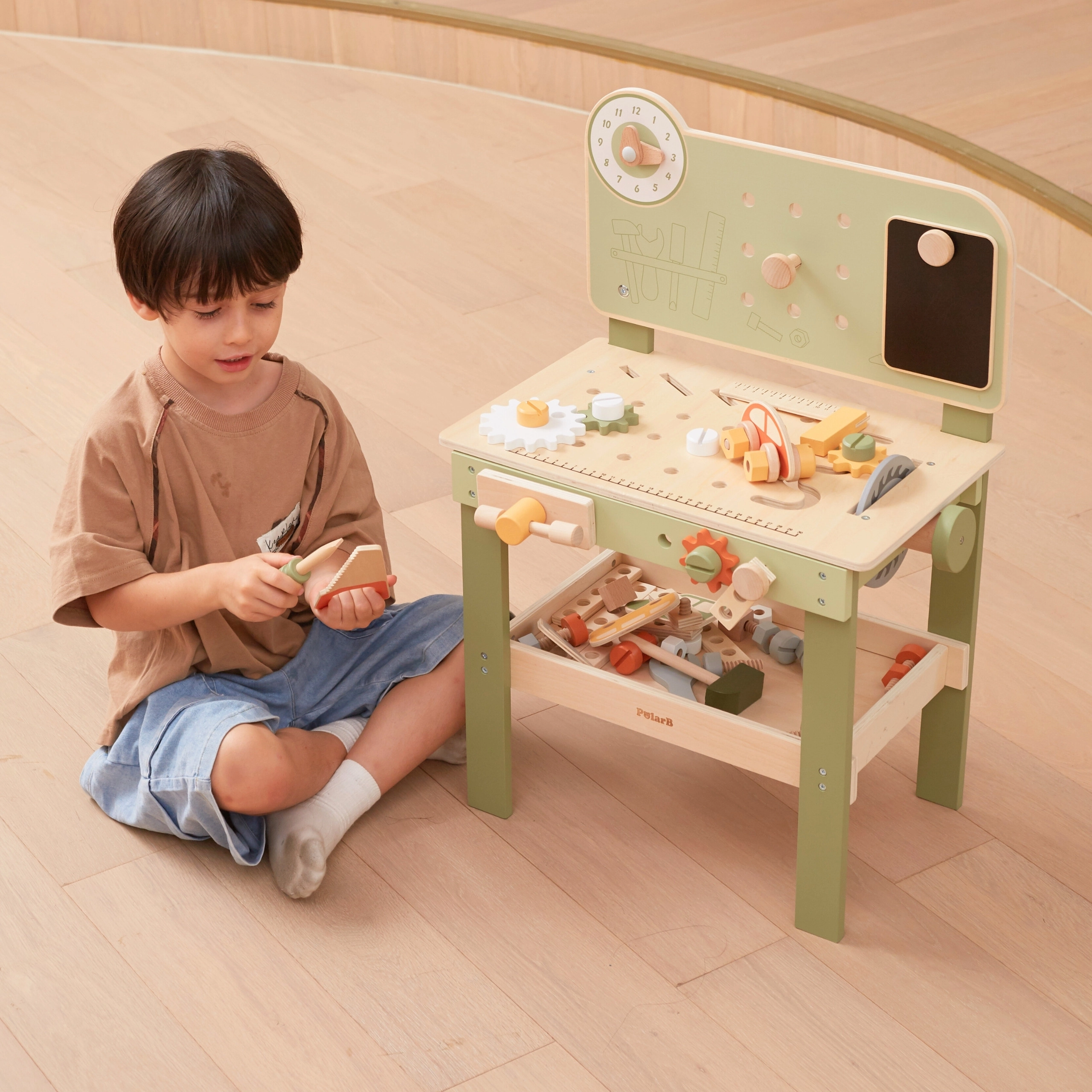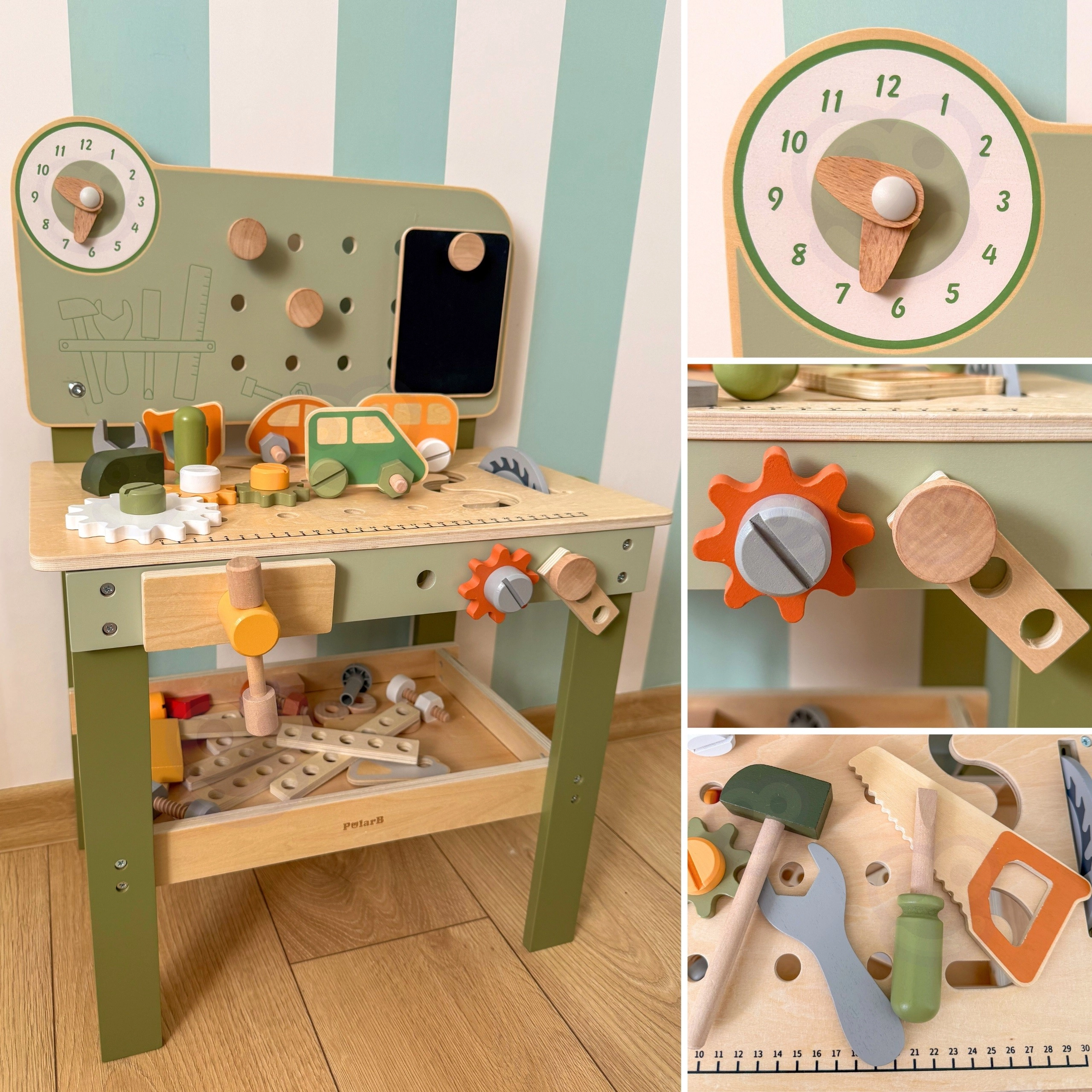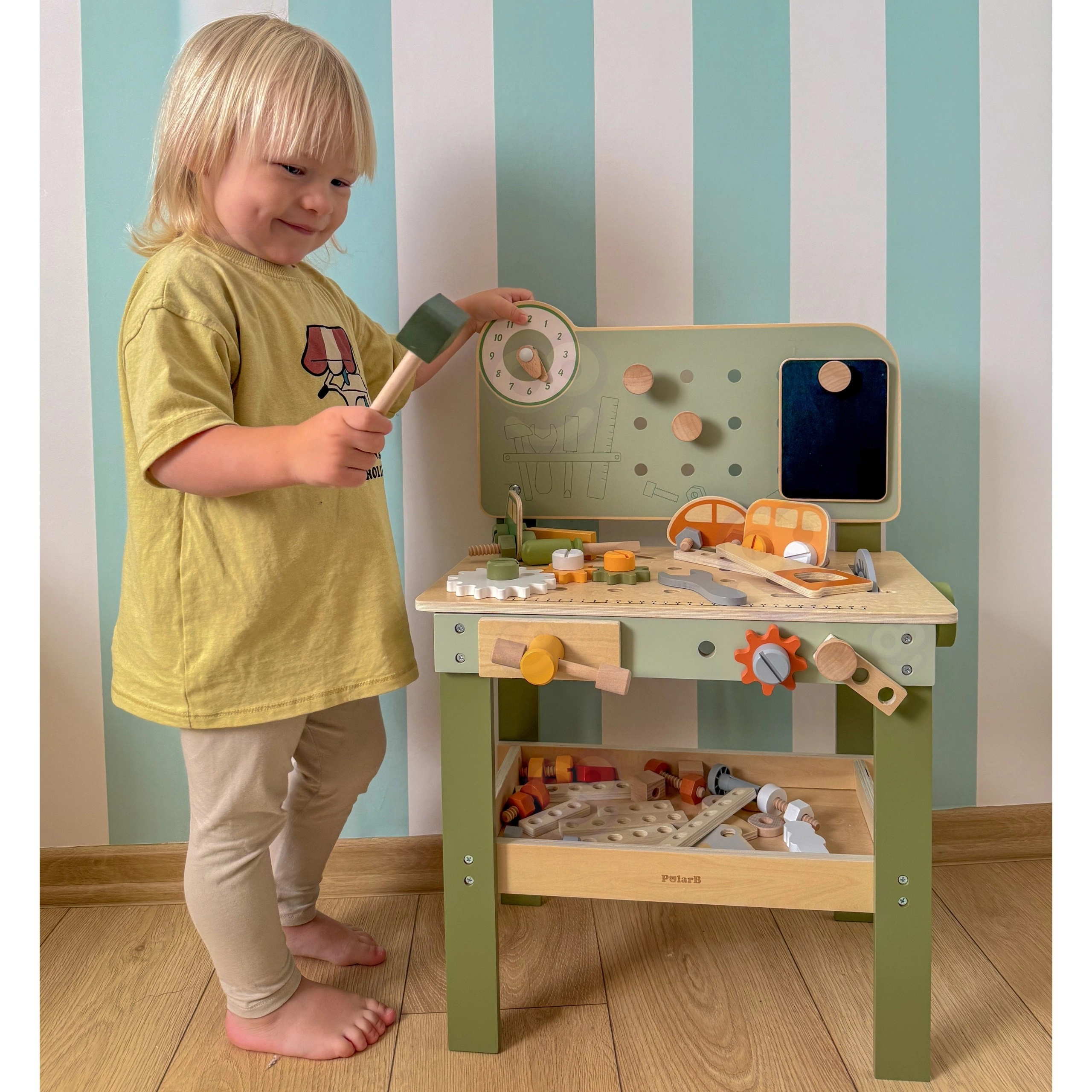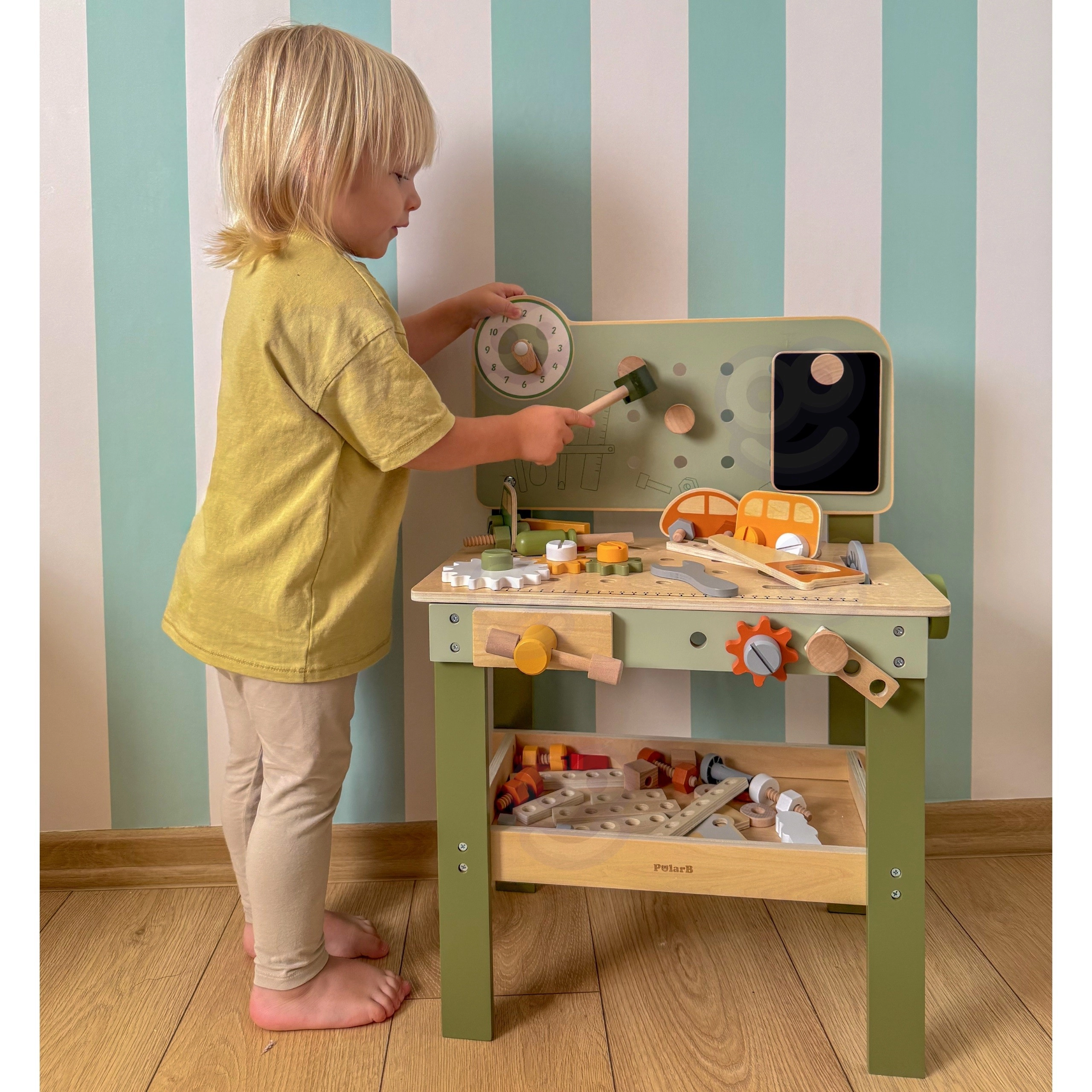 Descubre el robusto y estiloso banco Viga PolarB, diseñado para pequeños manitas a partir de 3 años. Gracias a su estructura de madera, engranajes que giran suavemente y abundantes accesorios, los niños entrenan la coordinación ojo–mano y aprenden a resolver tareas jugando. Los materiales seguros y los detalles bien pensados aseguran una larga durabilidad y un almacenamiento cómodo de las piezas.