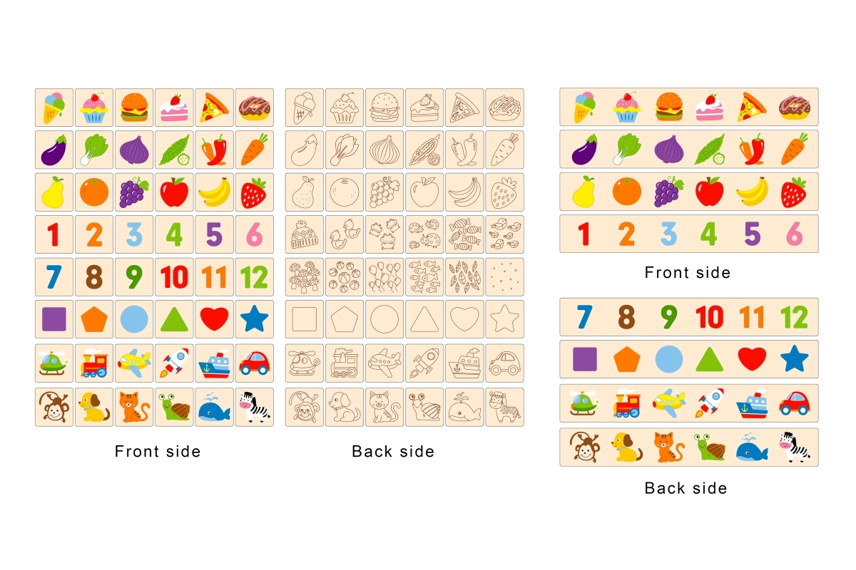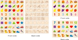 El paquete incluye una caja, 4 tablas largas y 48 bloques con motivos. Todo se guarda de nuevo en la cajita, por lo que no se pierde ninguna pieza.