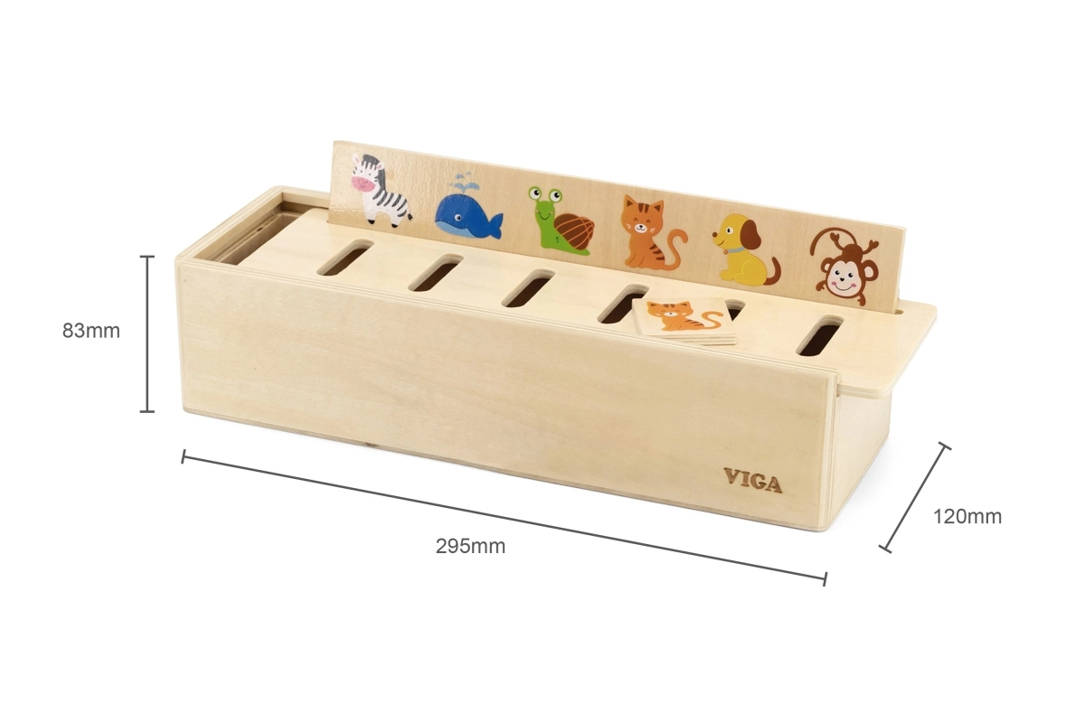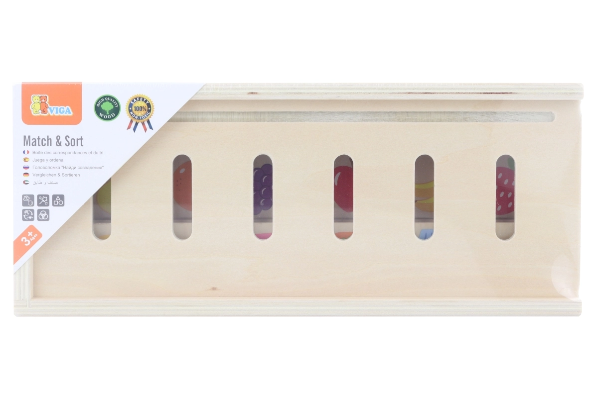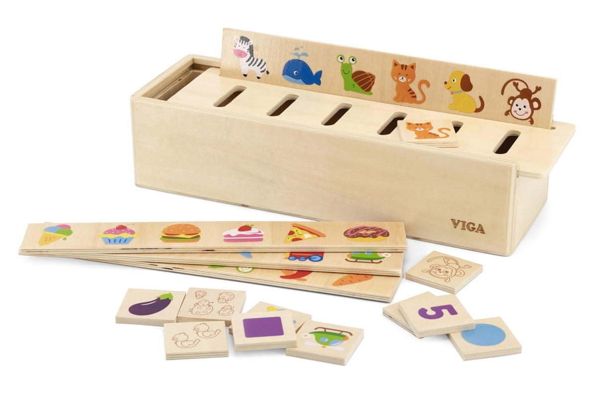 El clasificador de madera VIGA es un material educativo bien pensado al estilo Montessori. En la parte superior de la caja se coloca una de las tablas largas con motivos y el niño inserta las piezas de madera en los orificios correctos según las imágenes y categorías. El juego desarrolla la percepción visual, la motricidad fina y la concentración, y además enseña a los niños a reconocer frutas, verduras, animales, formas, medios de transporte y números.