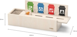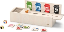 Este juguete educativo de VIGA es ideal para niños que están aprendiendo los fundamentos de la clasificación de residuos. Incluye una caja de madera con aberturas para insertar fichas y una tabla con diferentes cubos de basura. También incluye 50 fichas de madera con imágenes de residuos y colores correspondientes a categorías de reciclaje.