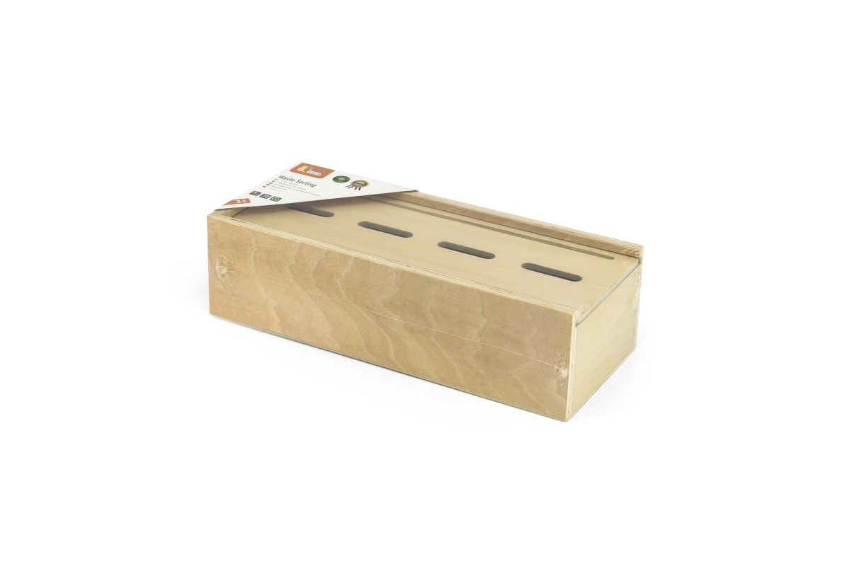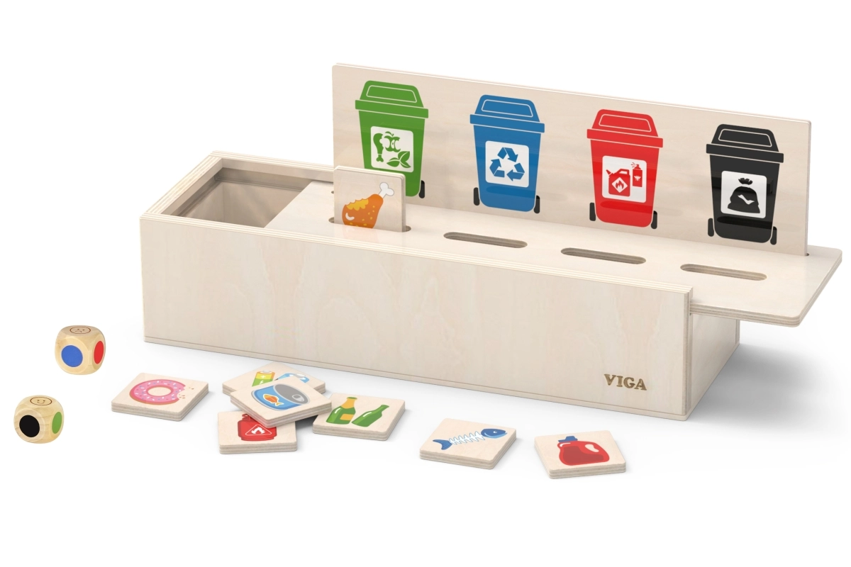 El juguete enseña a los niños a clasificar correctamente los residuos mediante divertidas fichas de madera y cubos identificados por colores.