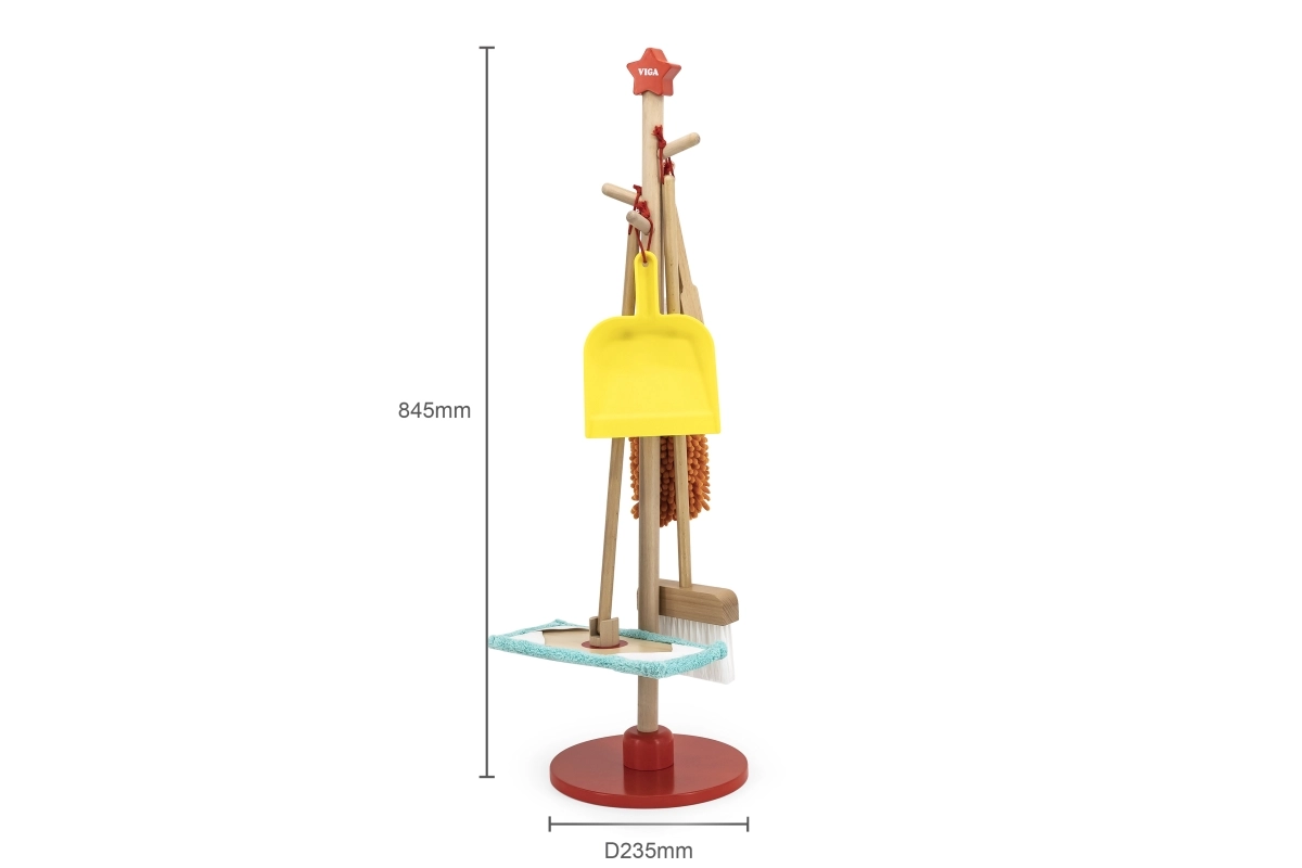 El juego de limpieza de madera Viga es ideal para pequeños ayudantes que quieren participar activamente en mantener el orden. Gracias a este set, que incluye escoba, fregona, plumero y otras herramientas, los niños desarrollan sus habilidades motoras y aprenden responsabilidad mientras juegan.