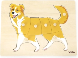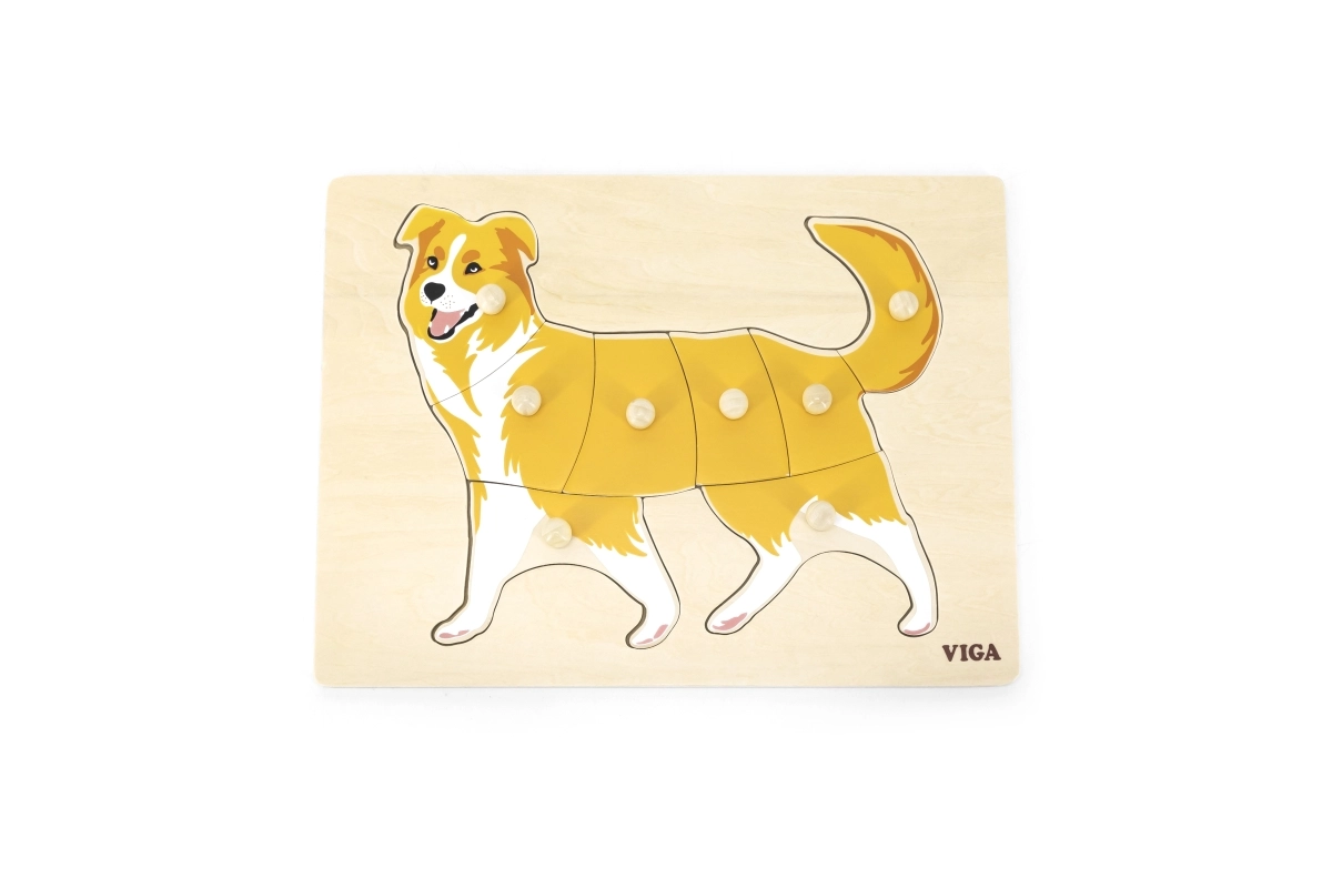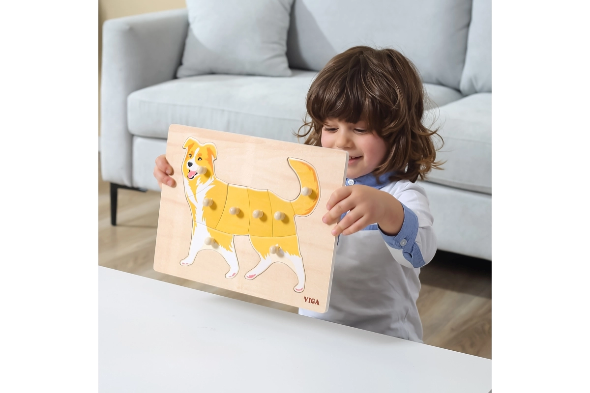 La base de madera resistente y los bordes suaves garantizan un juego seguro y duradero en casa y en el jardín de infancia. El claro motivo del perro invita a encajar una y otra vez.