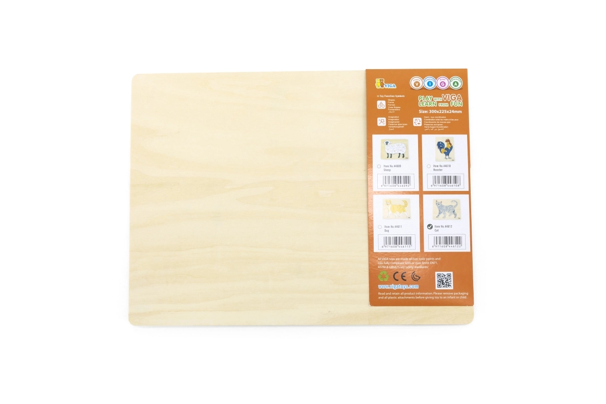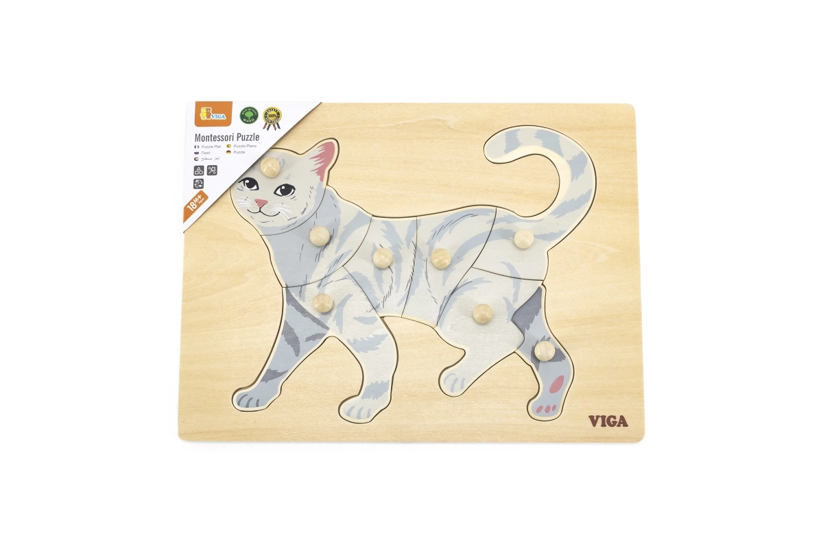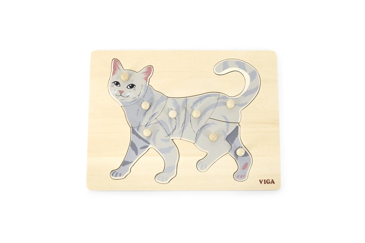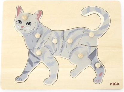 La tarea del niño es componer la imagen del gato no solo según la ilustración, sino también por la forma de cada pieza. Los pomos tipo botón facilitan el agarre con dedos pequeños y favorecen la correcta guía de la mano. El tablero de madera sólido mantiene las piezas firmes en su sitio y resiste el uso diario.