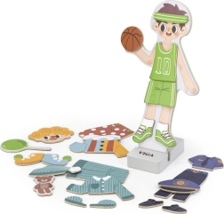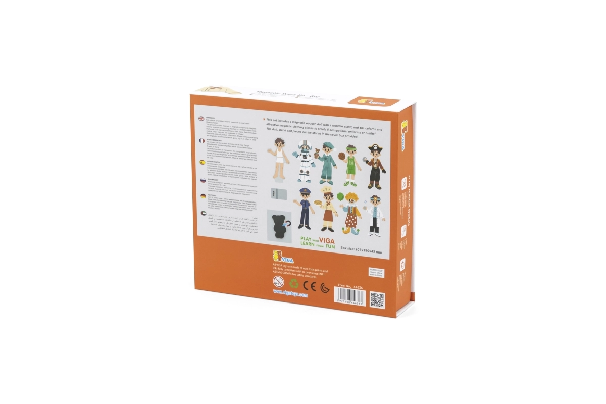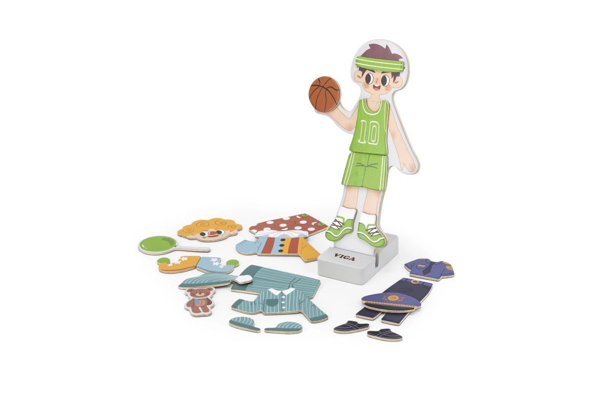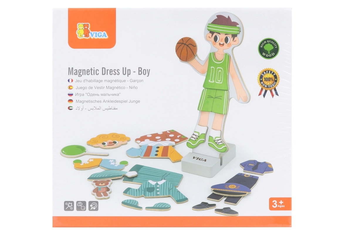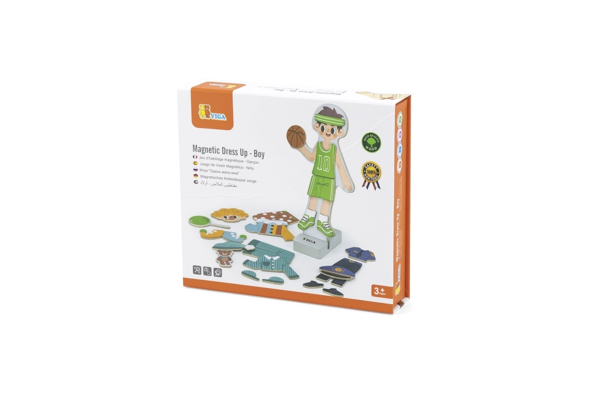 Este juguete de madera de alta calidad de la marca VIGA ofrece una divertida actividad de vestir una figura magnética de niño. Gracias a las diferentes prendas y accesorios, los niños crean fácilmente atuendos originales, ejercitan los deditos y aprenden a combinar colores y estilos.