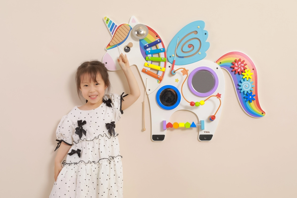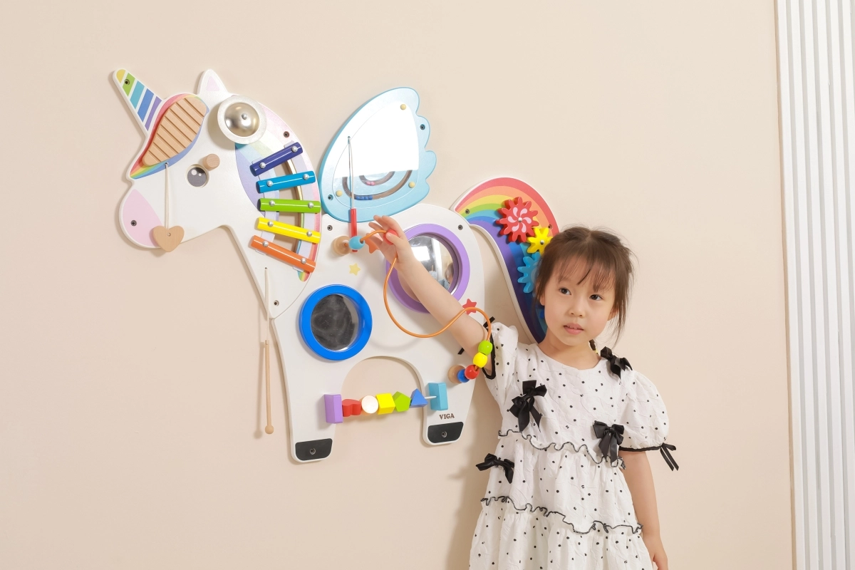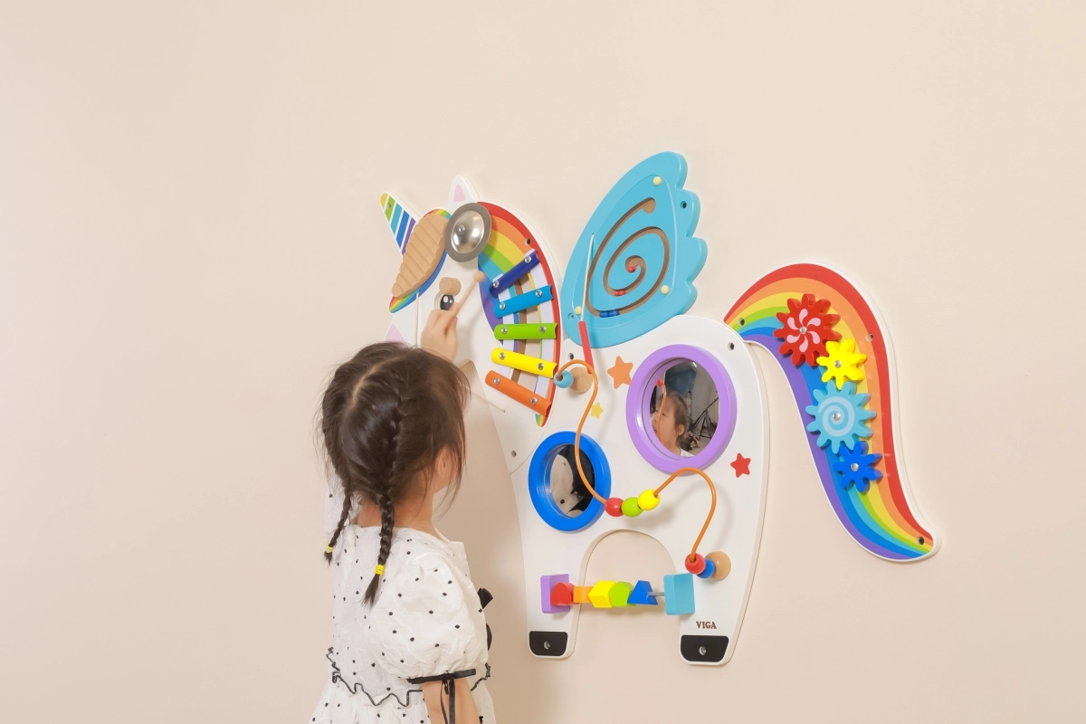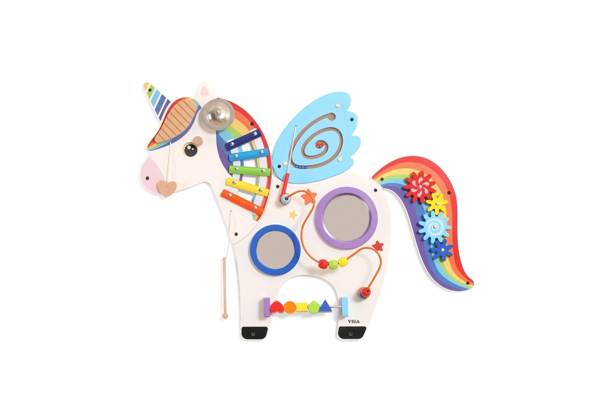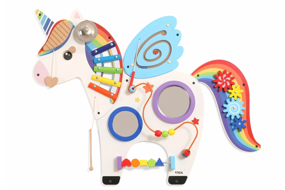 Este panel sensorial multifuncional de pared con forma de unicornio combina elementos musicales, táctiles y lógicos en un conjunto atractivo. Los niños pueden tocar el xilófono, hacer girar los engranajes, probar el laberinto magnético y los espejos, y practicar colores, formas y coordinación de movimientos.