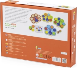Incluye 4× tablero de madera de pavo, 36 discos en 6 colores, 20 cartas de tareas de doble cara y 2 dados de colores. El juego favorece tanto la actividad individual como en equipo y es una excelente preparación para la educación preescolar.
