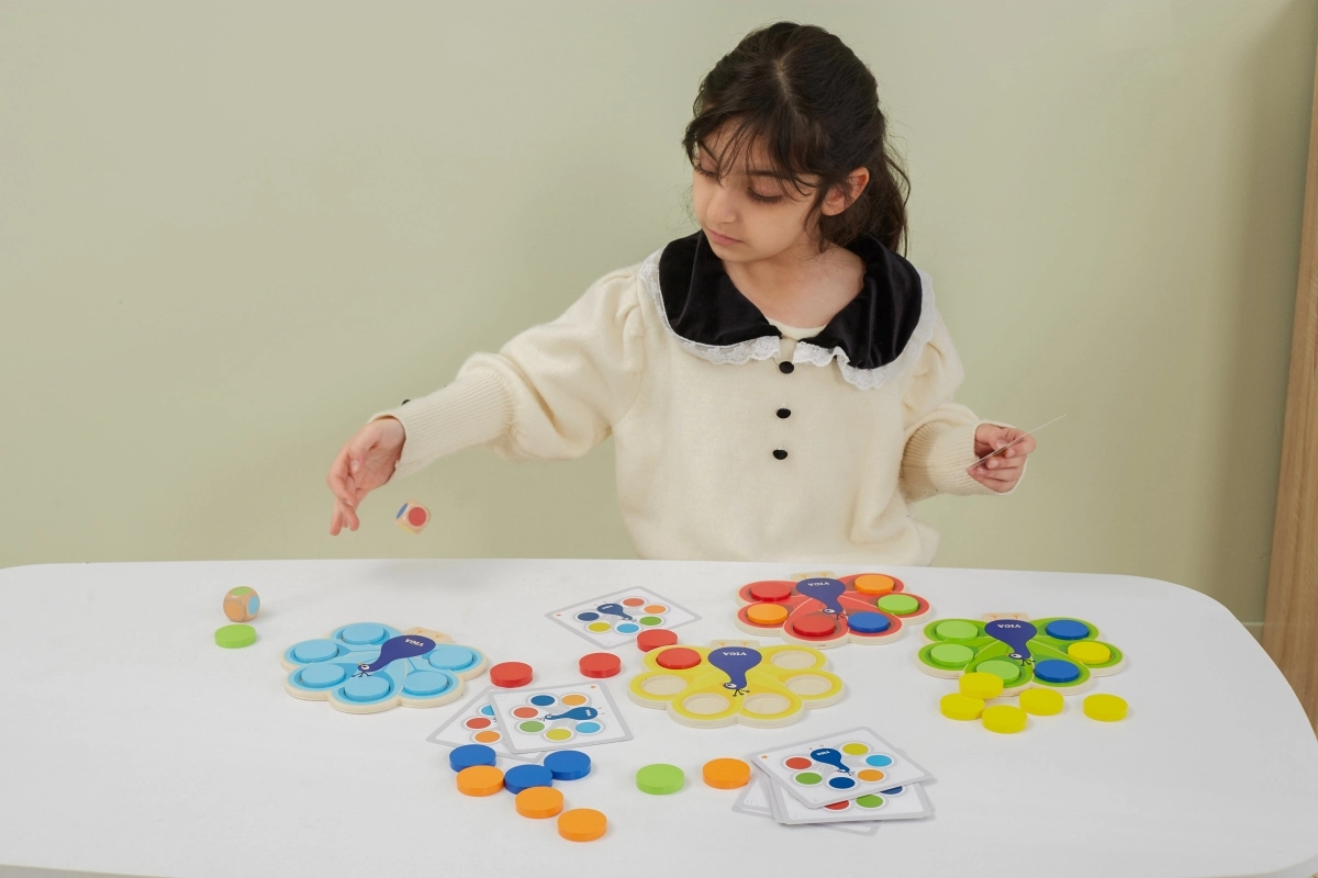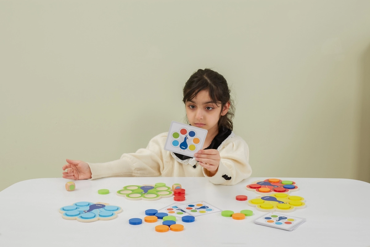 Los niños asignan los discos según las cartas o la tirada del dado, asimilando los colores de manera natural mientras entrenan la atención y la lógica.