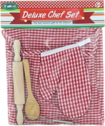 Completo set de cocina infantil para pequeños chefs a partir de 5 años que incluye todo lo necesario para los primeros pasos en cocinar y hornear. Contiene delantal, manopla, rodillo de madera (aprox. 20,5 cm), cuchara de madera (aprox. 14,5 cm) y batidor de metal (aprox. 12,5 cm). Ideal para desarrollar la motricidad fina, la creatividad y el juego seguro en la cocina.