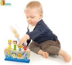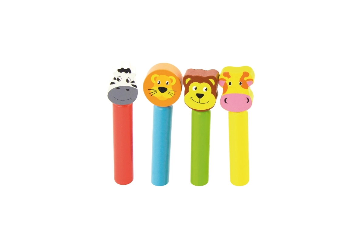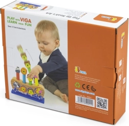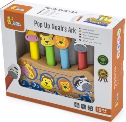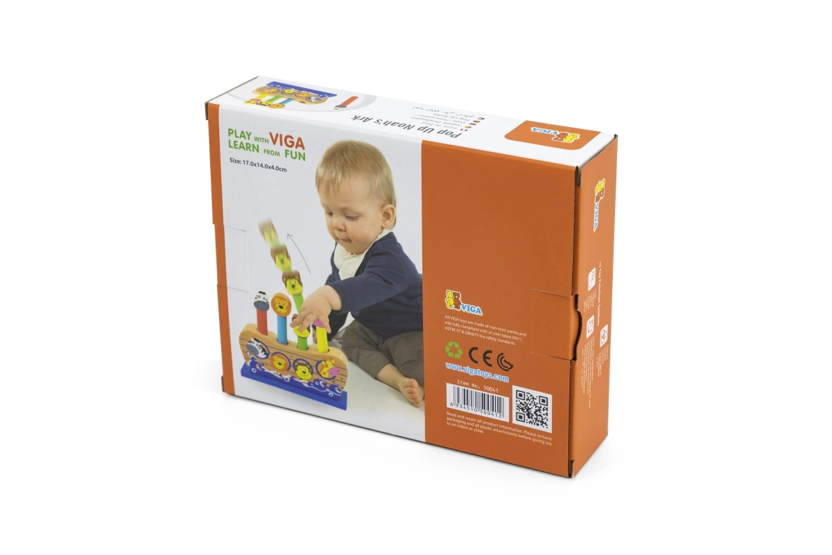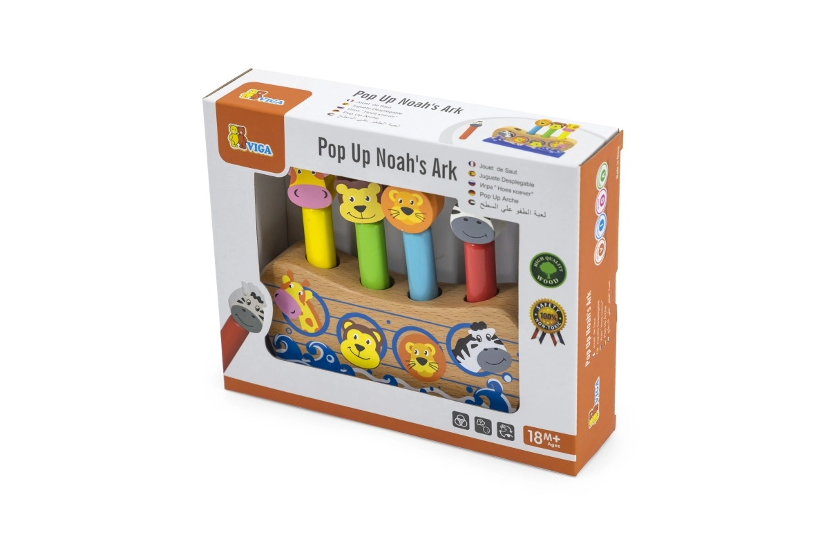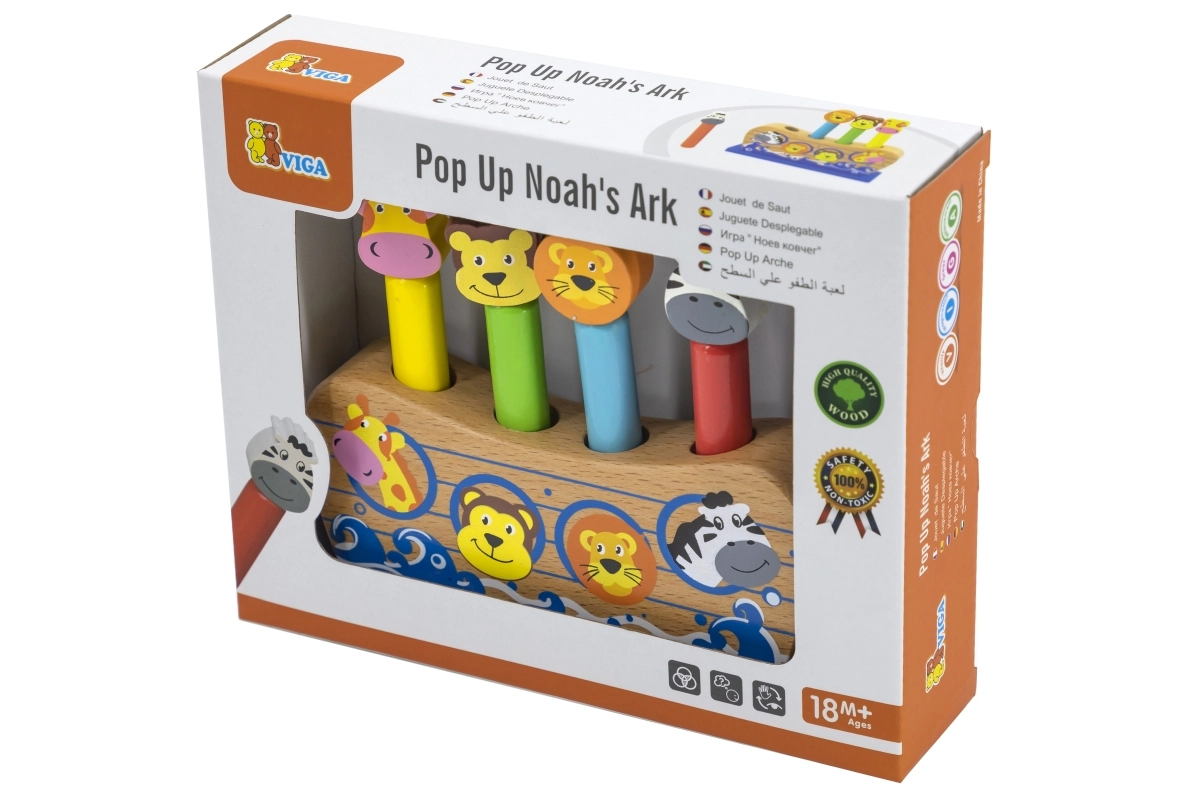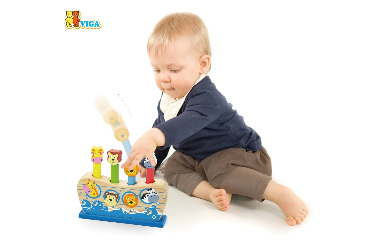Animales de madera saltarines Viga encantarán a cada niño con sus colores intensos y las simpáticas figuras de jirafa, monito, león y cebra. Basta con presionar la cabecita y el animalito salta desde el arca de Noé: un juego divertido que fomenta la coordinación ojo–mano, el aprendizaje de colores y el reconocimiento de animales. La fabricación segura en madera de alta calidad y pinturas no tóxicas garantizan un juego tranquilo y alegre.