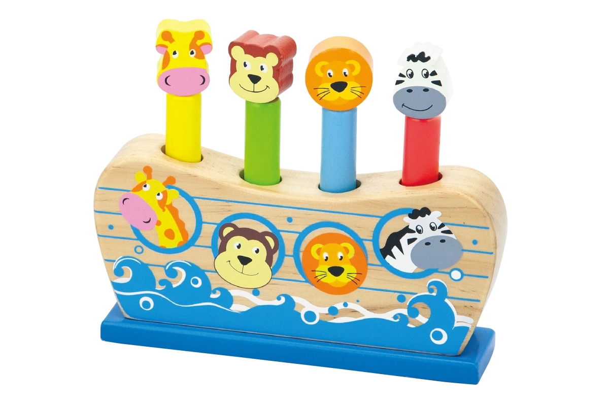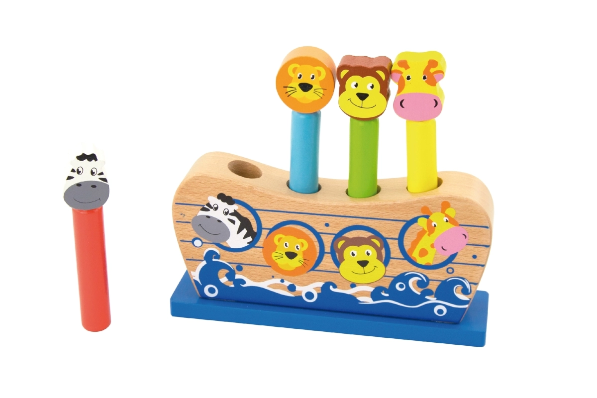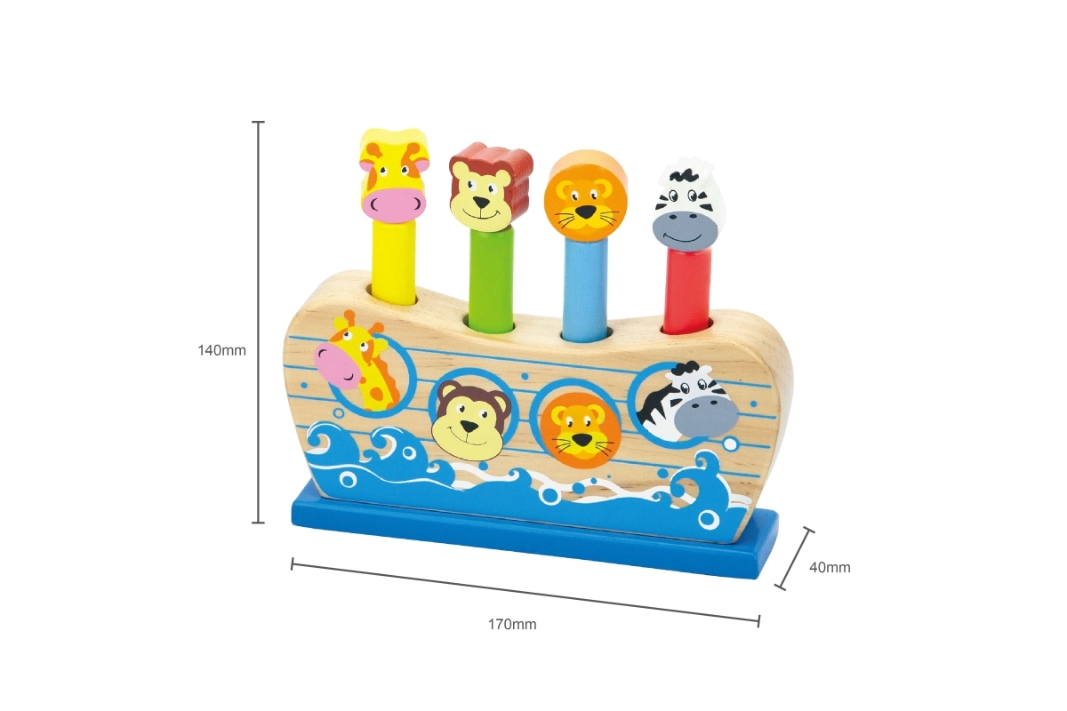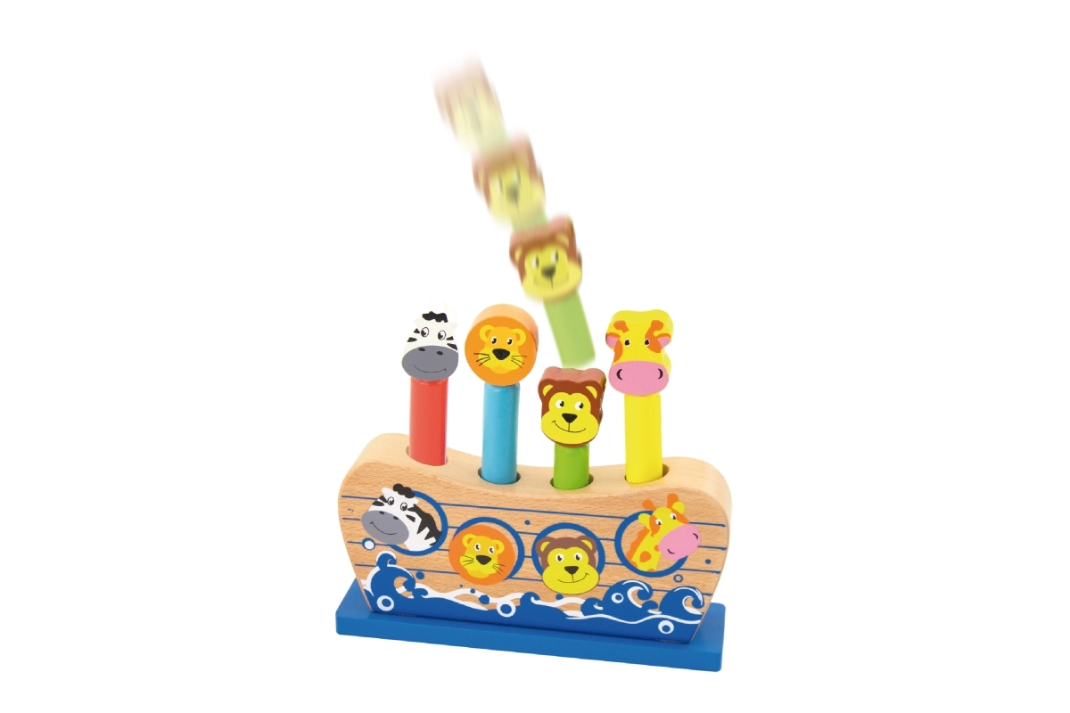 Presiona la cabecita y observa cómo la jirafa, el monito, el león y la cebra saltan alegremente desde el barco. Un juego ideal para comprender el principio de acción–reacción.