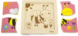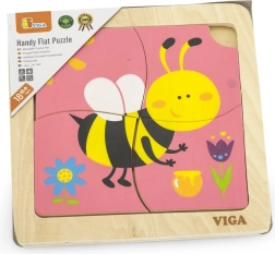 El rompecabezas incluye 4 piezas con motivo de abeja que se encajan formando la imagen en la base.