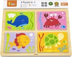 Este set incluye cuatro sencillos rompecabezas de madera con adorables motivos de animales marinos. Gracias a su número compacto de piezas, son ideales para la primera toma de contacto de los niños con los puzzles, desarrollan la coordinación mano-ojo y enseñan paciencia.