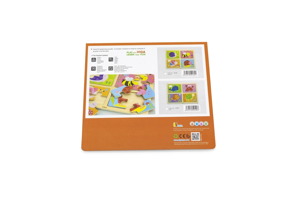 Cada rompecabezas tiene su propia base, lo que facilita la orientación y ayuda a los niños a lograr el éxito más rápido. Las piezas de madera resistentes son agradables al tacto, se sujetan bien y soportan un uso frecuente.