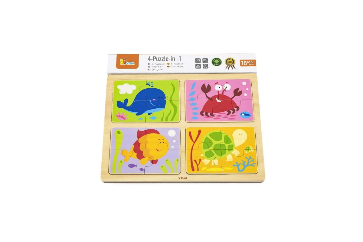 Descubre la alegría de armar estos rompecabezas de madera 4 en 1 con motivos de animales marinos. Cuatro puzzles independientes (ballena, cangrejo, pez y tortuga) fomentan la motricidad fina, el pensamiento lógico y el reconocimiento de formas y colores. Ideal para niños a partir de 18 meses.