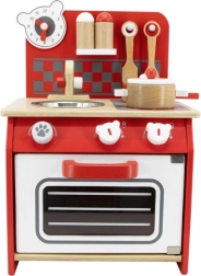 Gracias a su acabado de madera de alta calidad, esta cocinita no solo es duradera, sino también estéticamente atractiva. El paquete incluye además accesorios de juego, como una cuchara de cocina, un cucharón, una olla con tapa, una sartén con tapa y dos especieros.