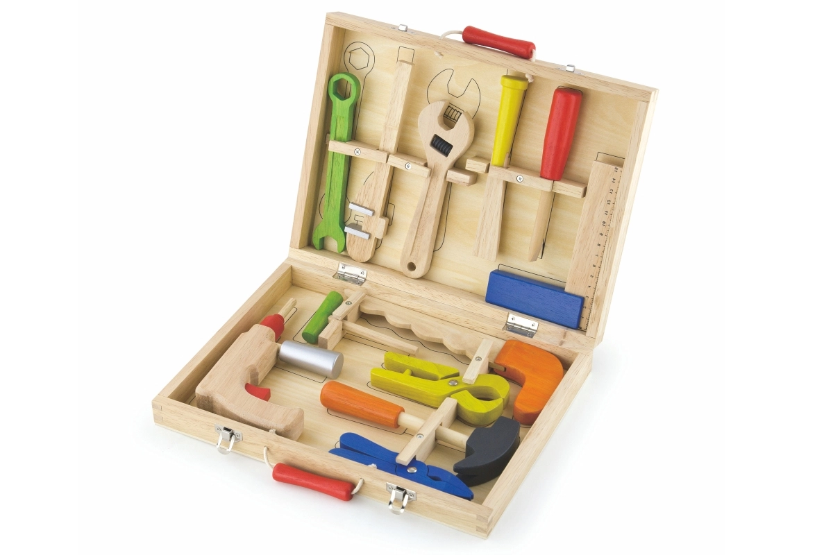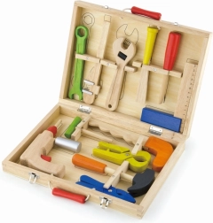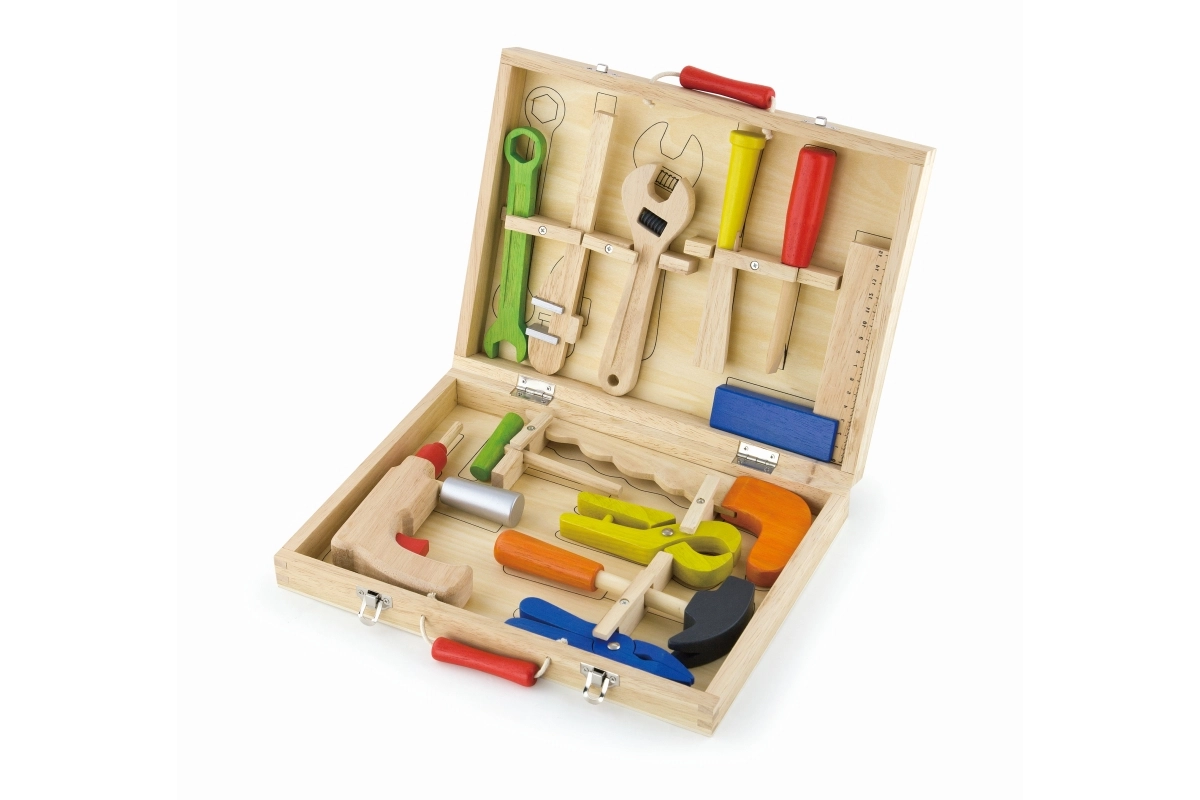Práctico juego de herramientas de madera en un maletín resistente para pequeños maestros a partir de 3 años. Incluye 12 piezas (taladro, martillo, sierra, llave, destornillador, etc.) que desarrollan la motricidad fina, la creatividad y el juego de imitación. Dimensiones compactas aprox. 31,5 × 24 × 6 cm, cierres metálicos y asa roja para un fácil transporte.