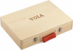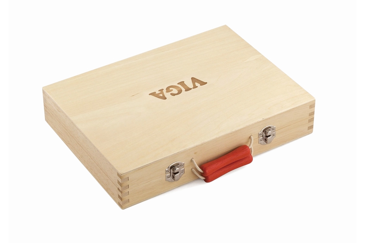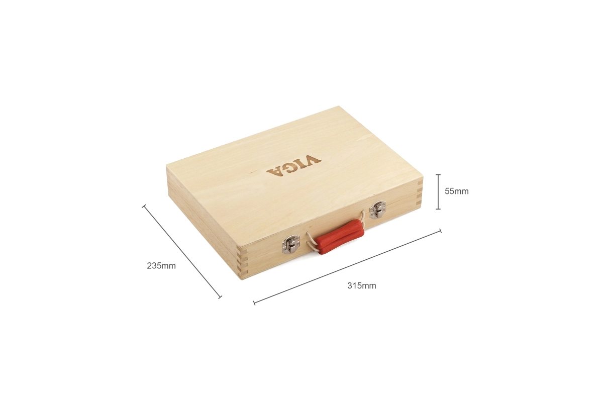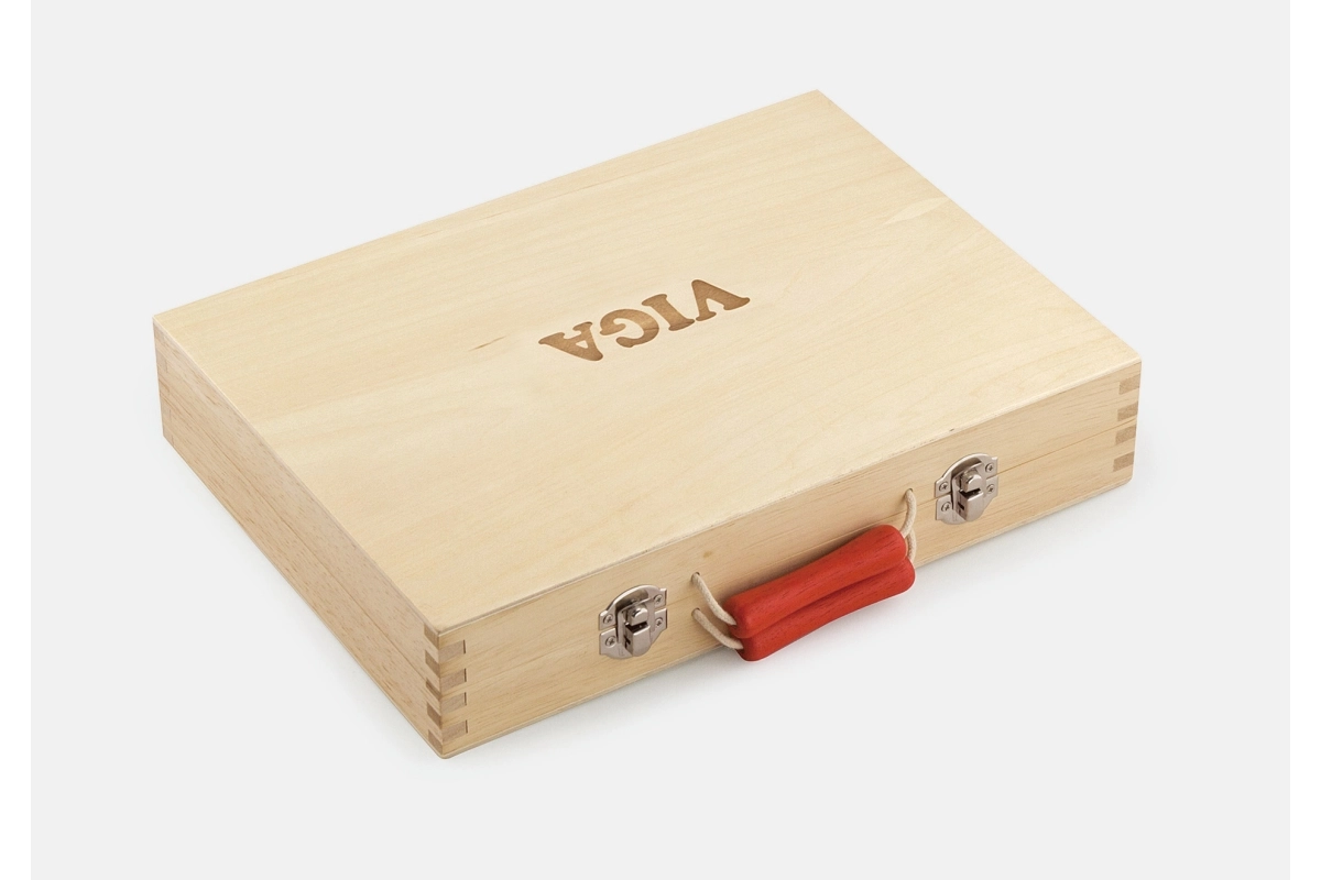 El resistente maletín de madera con cierres metálicos y asa roja mantiene todo en su sitio, por lo que ninguna pieza se pierde. Gracias a su organización clara, cada herramienta tiene su lugar y todo el set se puede transportar fácilmente a visitas, viajes o al cuarto infantil.