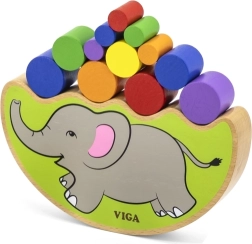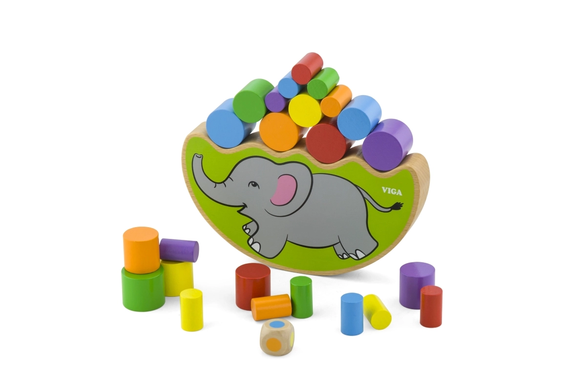 - Base de equilibrio con forma de elefante, cilindros de madera de colores, dado de colores