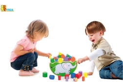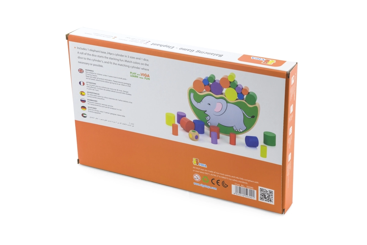 Divertido juego de madera para niños a partir de 3 años que desarrolla la motricidad fina, la paciencia y la coordinación ojo–mano. Los jugadores lanzan un dado de colores y, según el color obtenido, quitan o colocan un cilindro en la base del elefante ¡sin volcarlo!