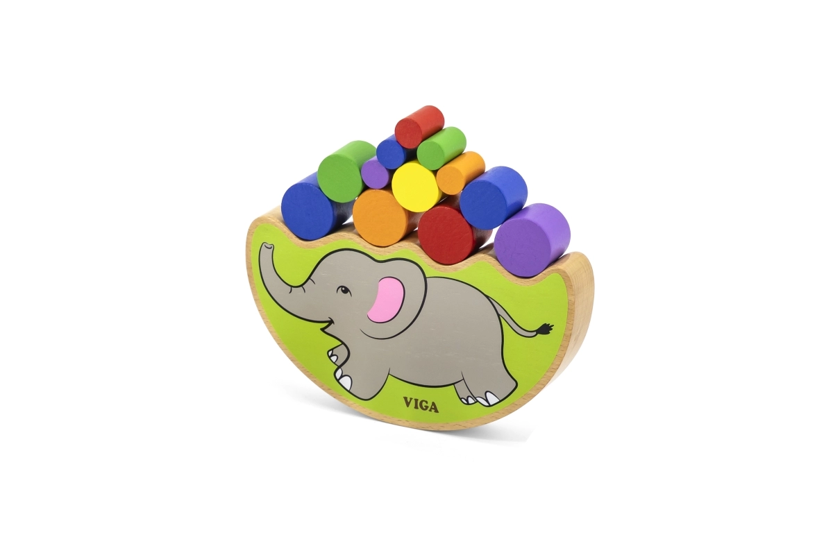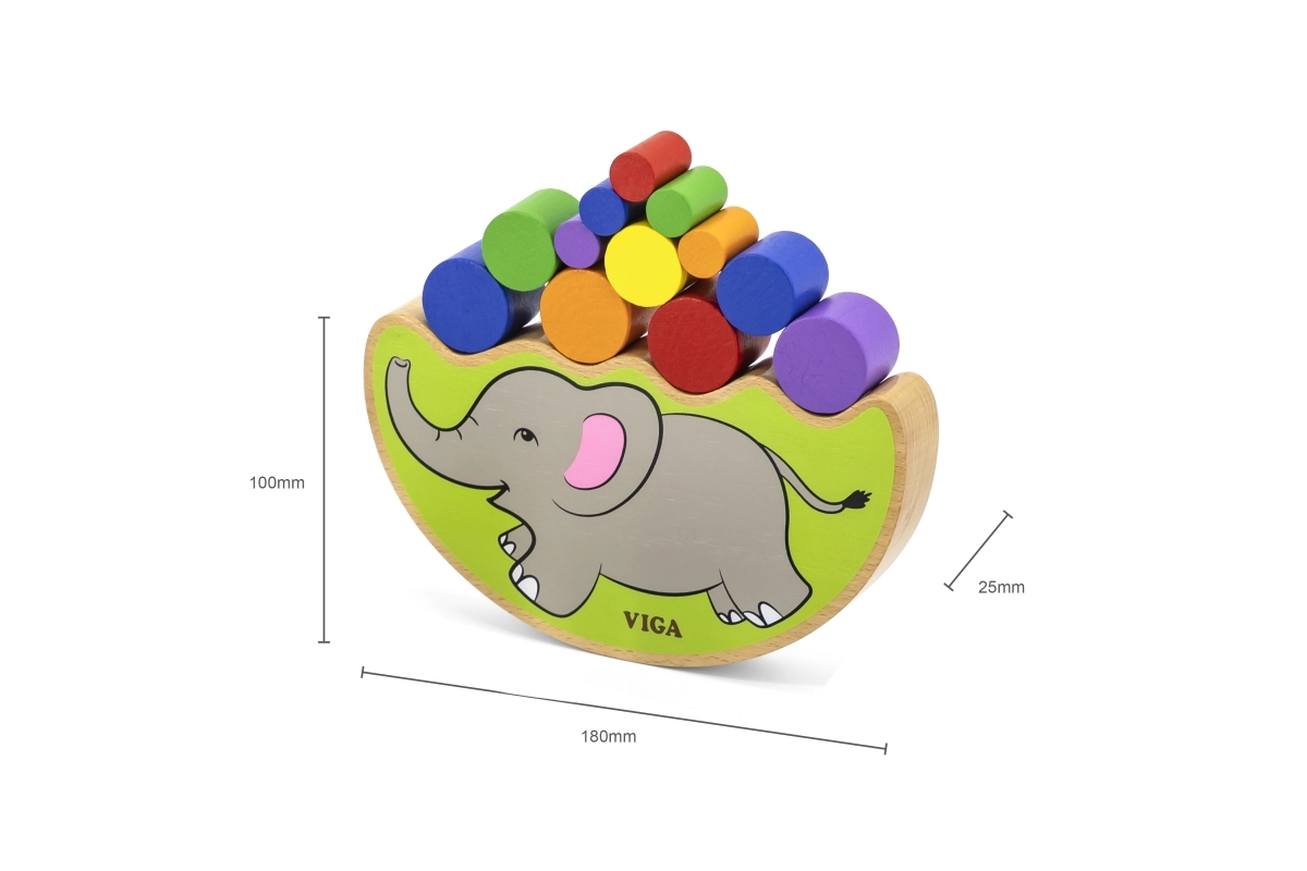 La base arqueada del elefante y los cilindros de distintos tamaños enseñan a los niños a equilibrar con delicadeza y a colocar las piezas con precisión.