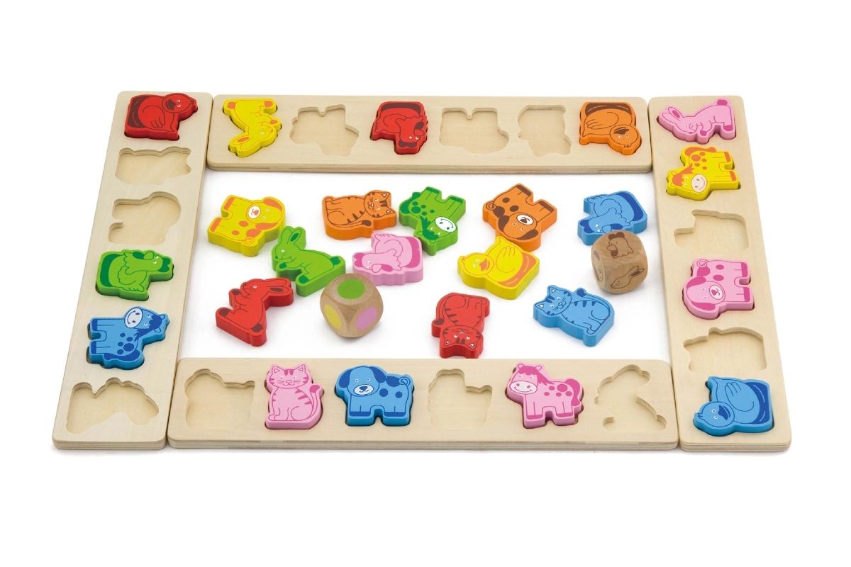 Divertido juego de madera para niños a partir de 3 años que desarrolla el reconocimiento de colores y animales, entrena el pensamiento rápido y los reflejos y fomenta habilidades lingüísticas, de conteo y de trabajo en equipo. El set de contrachapado de calidad y madera de haya incluye 4 tableros, 36 piezas de animales y dos dados: uno de colores y otro con animales.