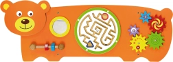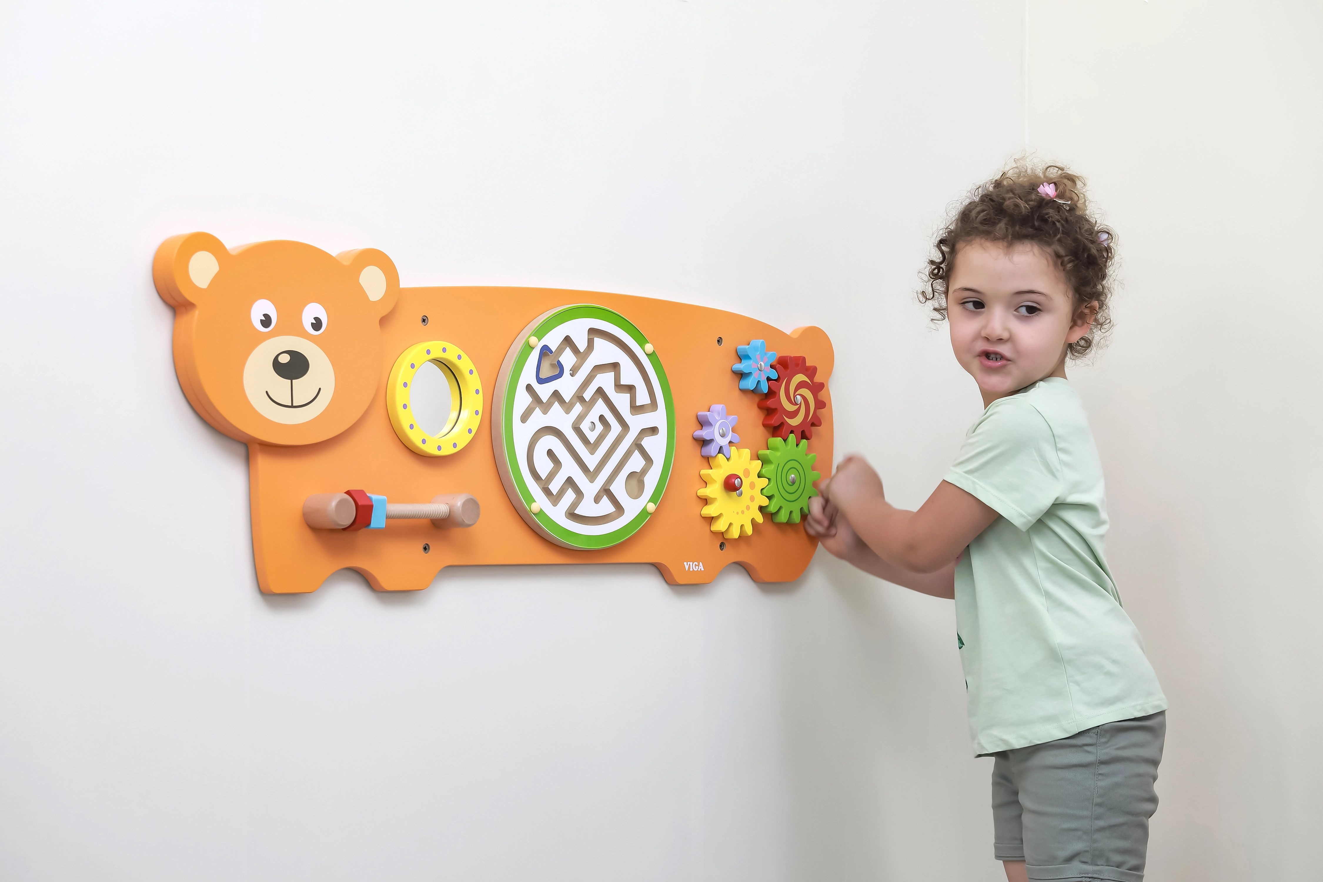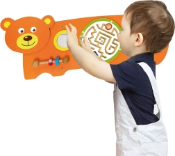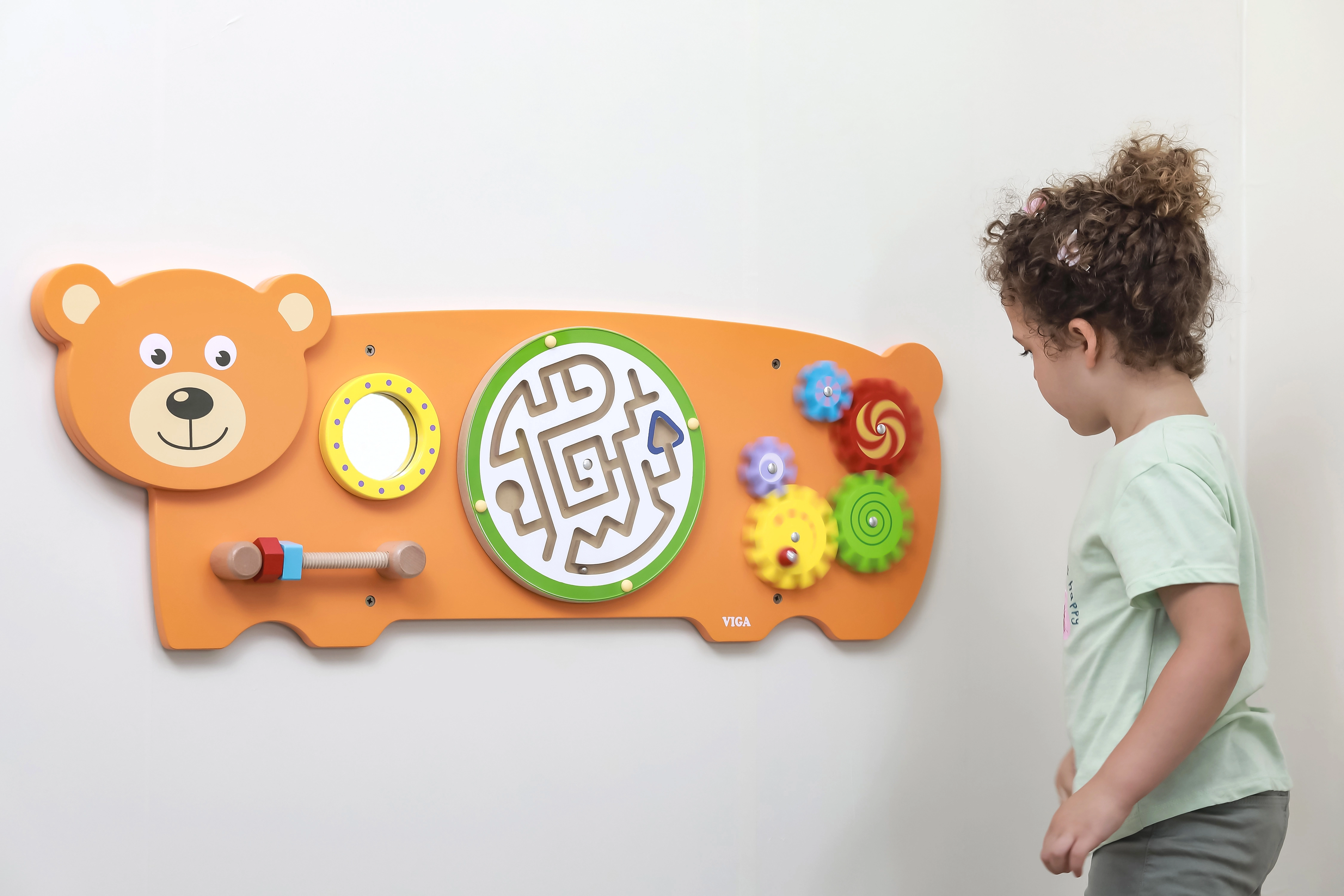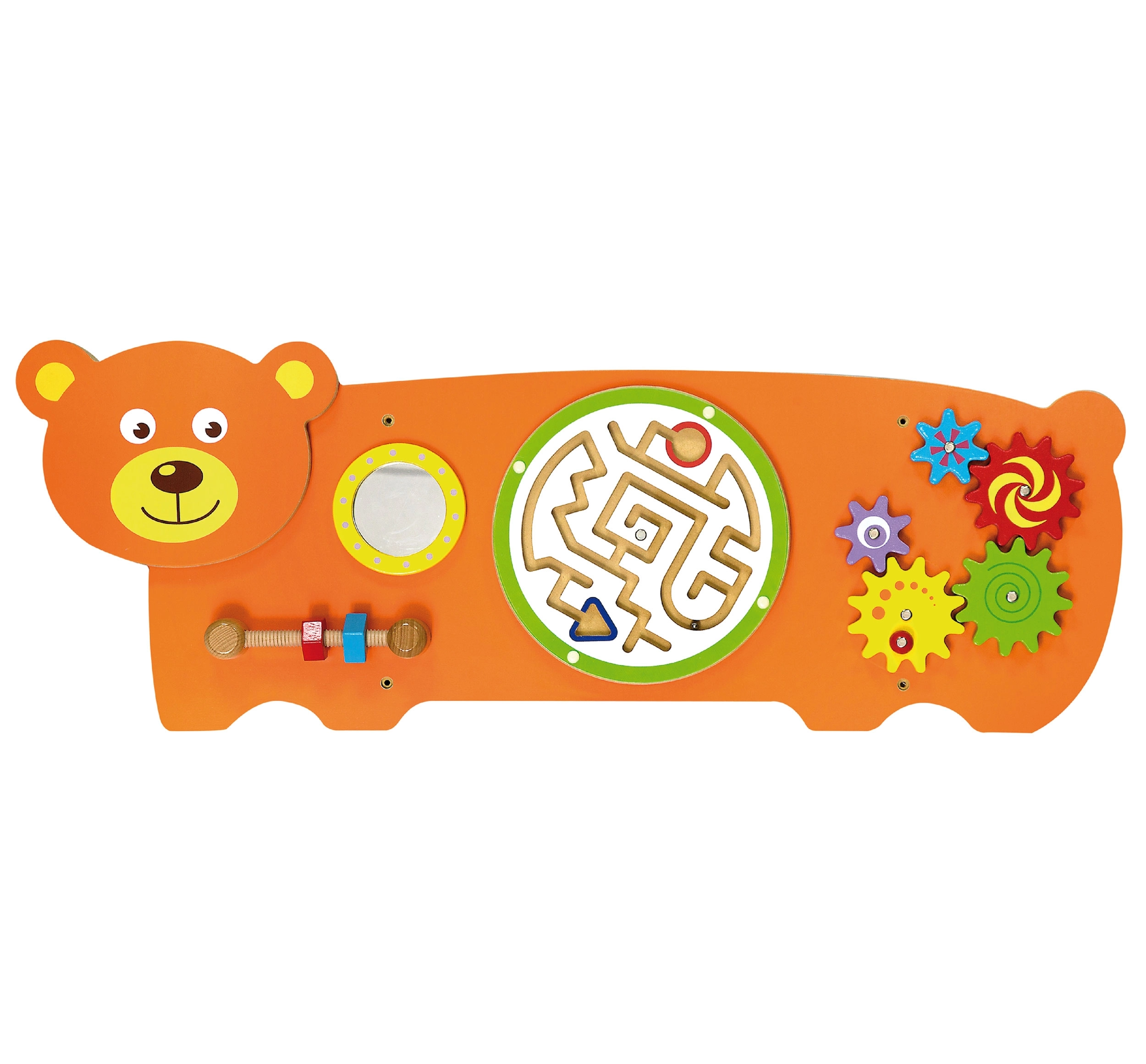 El tablero sensorial Osito está diseñado según los principios Montessori para motivar de forma natural a los niños a explorar y practicar habilidades. Ofrece varios tipos de actividades: girar engranajes, guiar la bolita en el laberinto, observarse en el espejo seguro y entrenar el agarre con tornillos roscados. Gracias a su robusta construcción de madera y a la posibilidad de montaje en pared, es ideal para habitaciones infantiles, salas de juego y jardines de infancia.