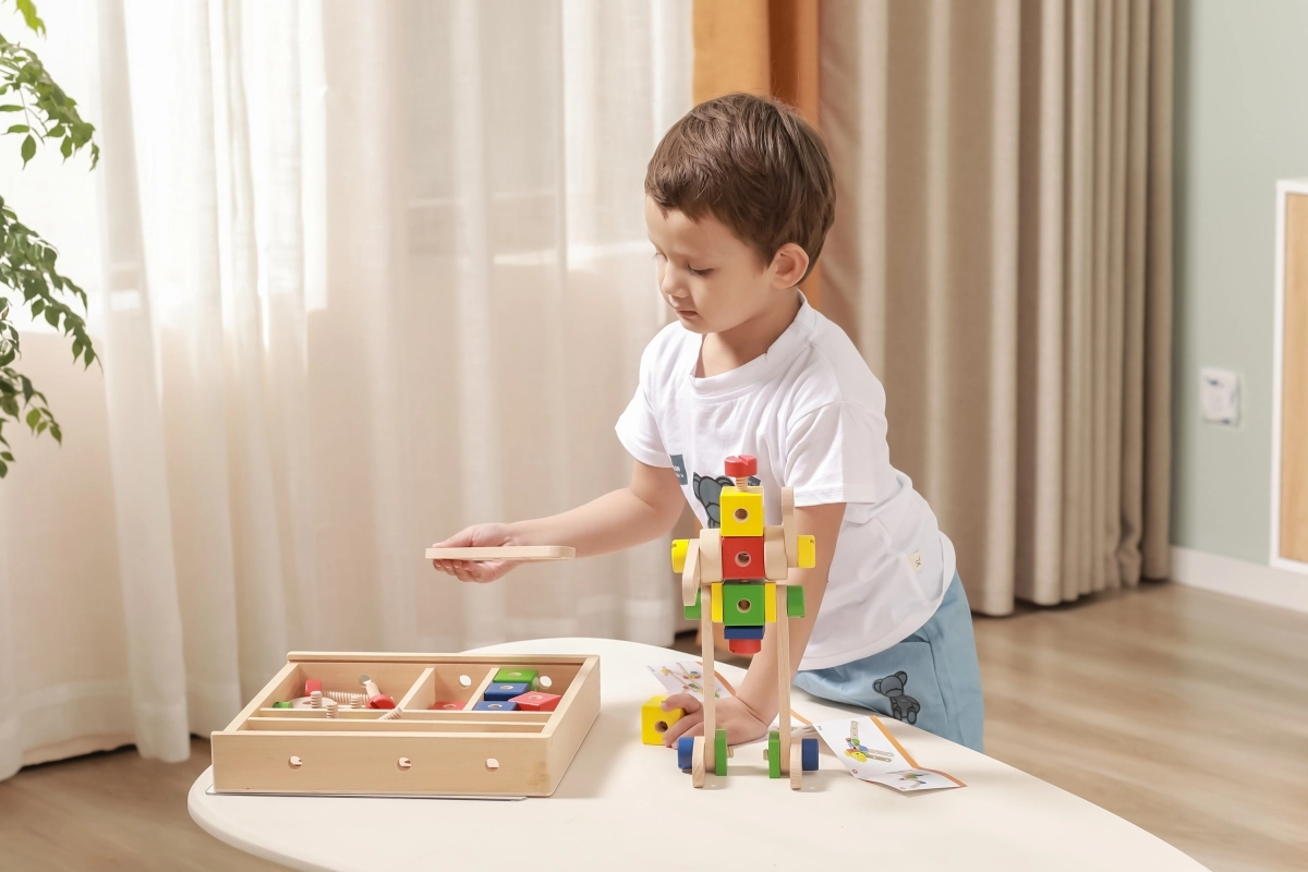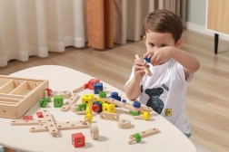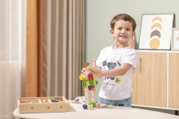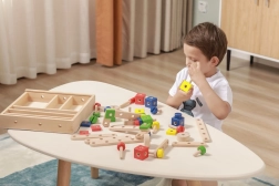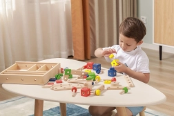 El set desarrolla la motricidad fina, la coordinación ojo–mano y el pensamiento lógico y espacial. La madera natural combinada con colores vivos invita a jugar y aprender de forma divertida. Todo se guarda de forma ordenada en una caja con tapa transparente para recoger fácilmente y tener siempre las piezas a mano.
