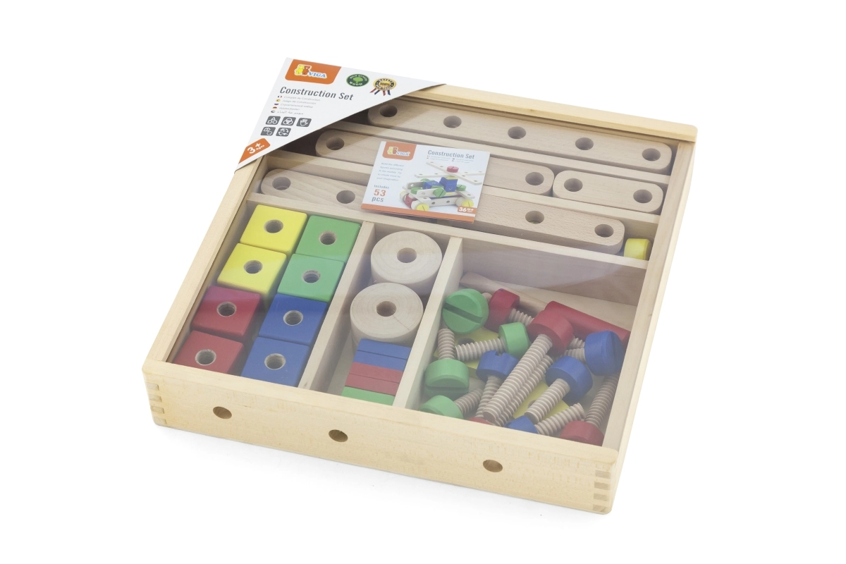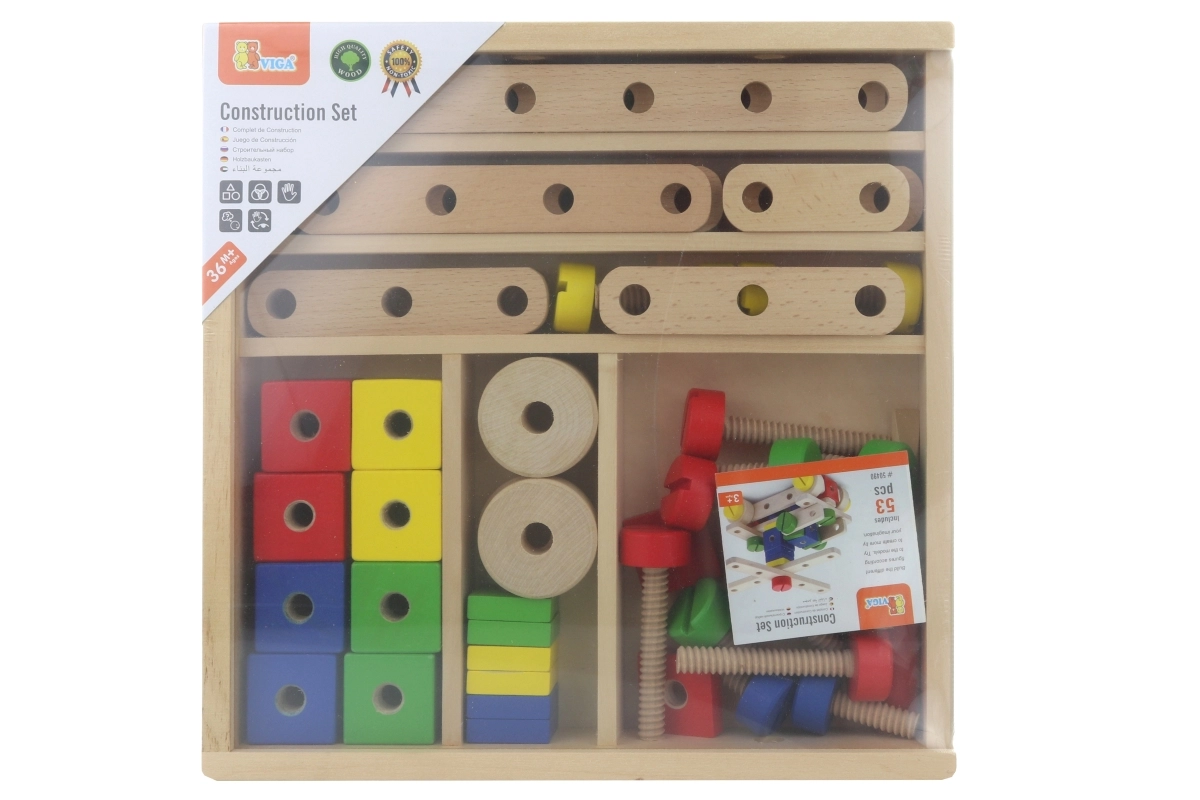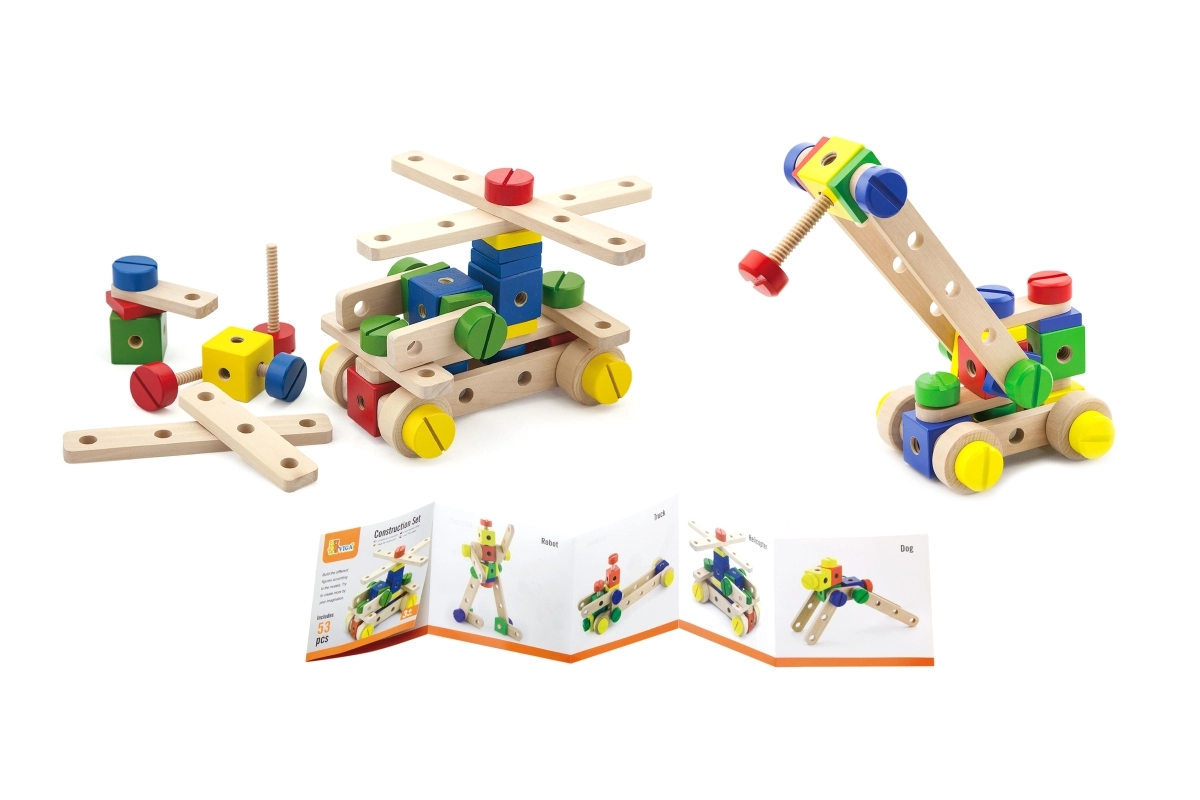 Descubre el divertido y educativo juego de construcción de madera con 53 piezas y folleto ilustrado para construir fácilmente. Fomenta la motricidad fina, la creatividad y el pensamiento espacial. Ideal para niños a partir de 3 años, guardado en una caja práctica de 31 × 31 × 5,5 cm.