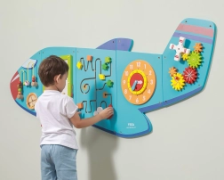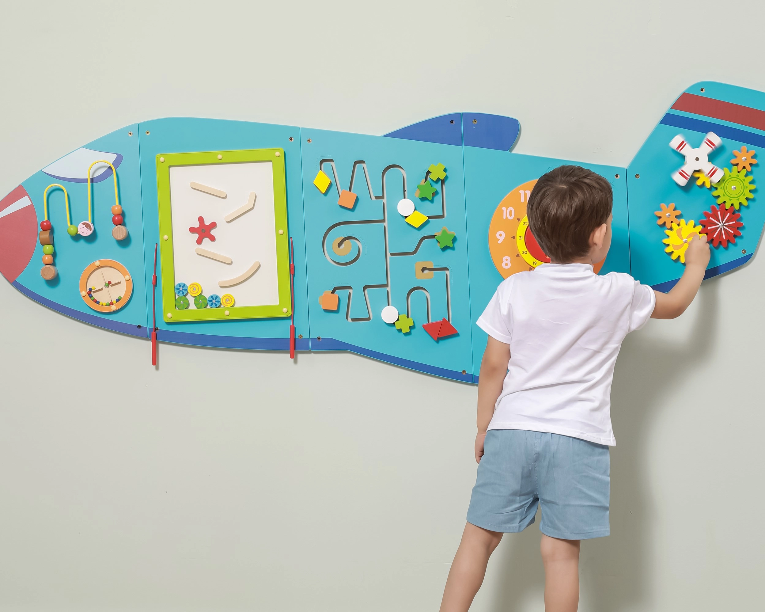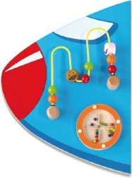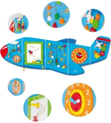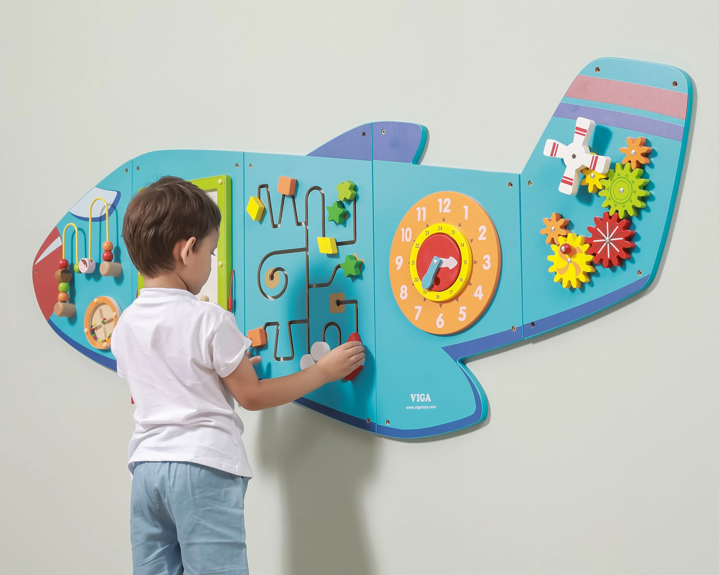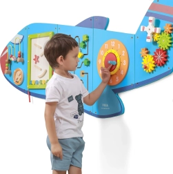 El tablero de pared de madera Avión de la marca VIGA es un juguete multifuncional compuesto por cinco partes que juntas forman la silueta de un avión. Cada elemento ofrece un tipo distinto de actividad para un desarrollo lúdico de las habilidades de los niños: