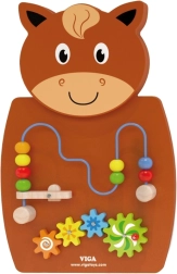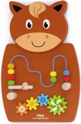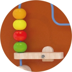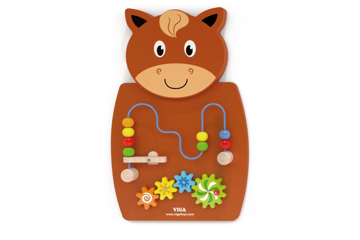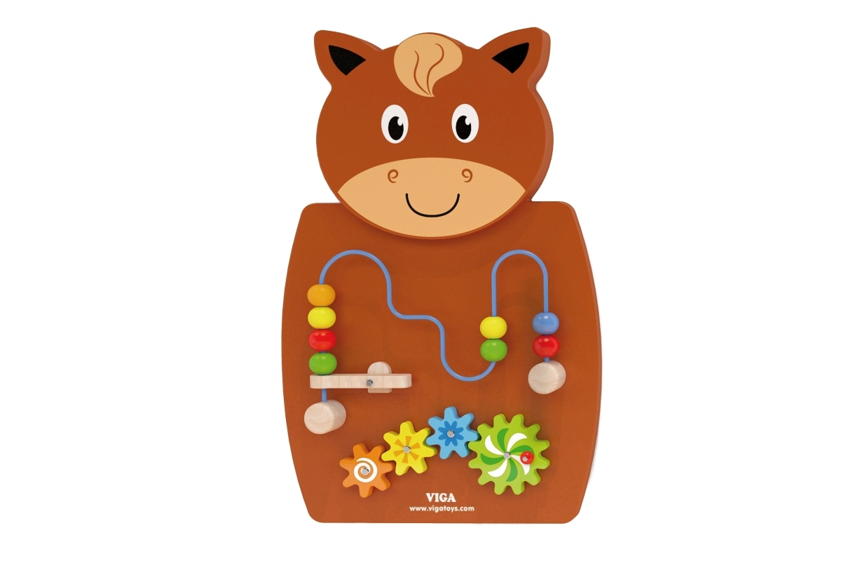El tablero de actividades de madera con forma de caballo es uno de los juguetes líderes en el desarrollo de la creatividad y el aprendizaje infantil. Está equipado con engranajes de madera y un recorrido para cuentas en un alambre, que los niños pueden mover mediante un mecanismo de palanca. Este juguete destaca por su variedad de colores y formas, ayudando a desarrollar la capacidad de reconocer colores y formas.