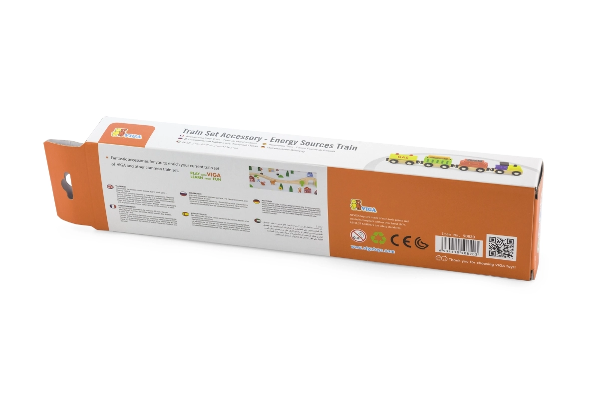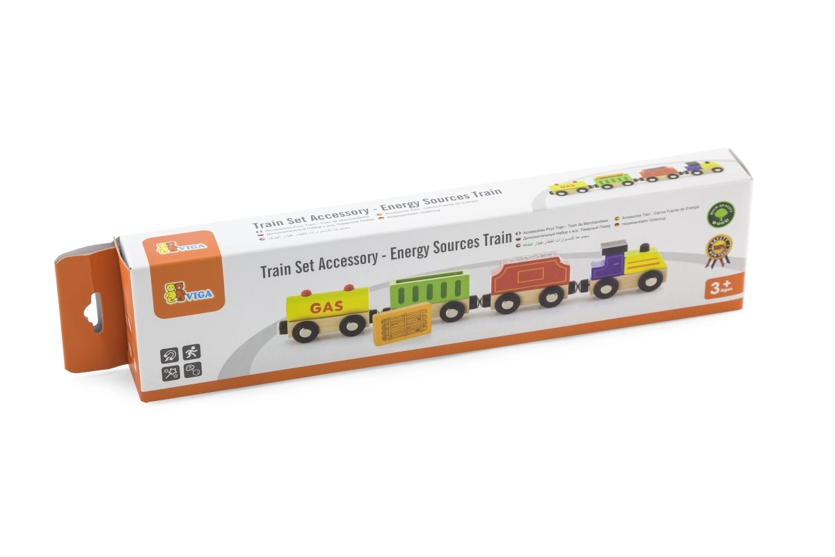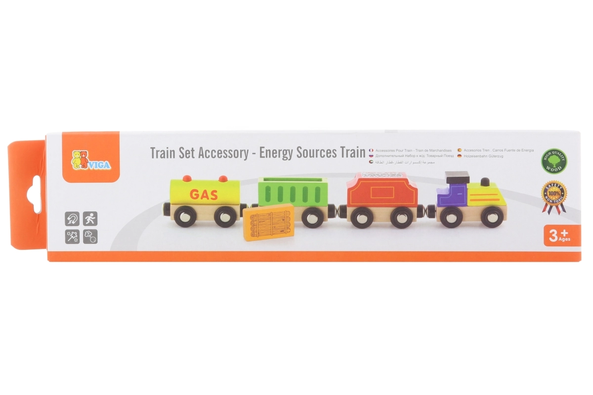 El tren VIGA con temática de fuentes de energía aporta mucha diversión y aprendizaje. El conjunto incluye una locomotora y tres vagones diferentes (p. ej., cisterna, de carga y de carbón), que los niños conectan fácilmente con imanes. La fabricación de madera de calidad y el diseño colorido invitan al juego y estimulan la imaginación.