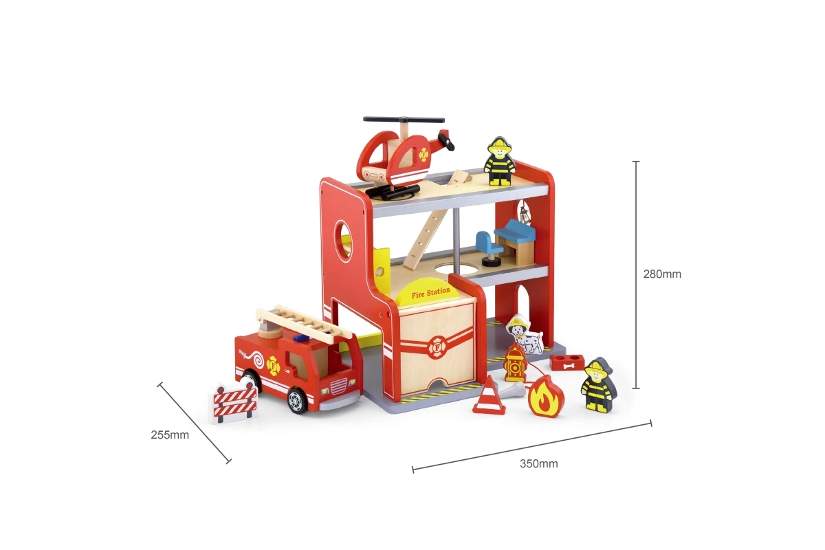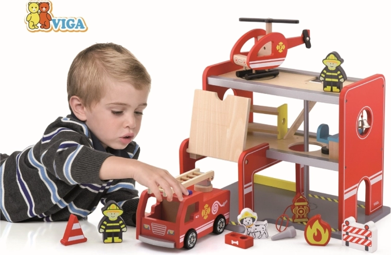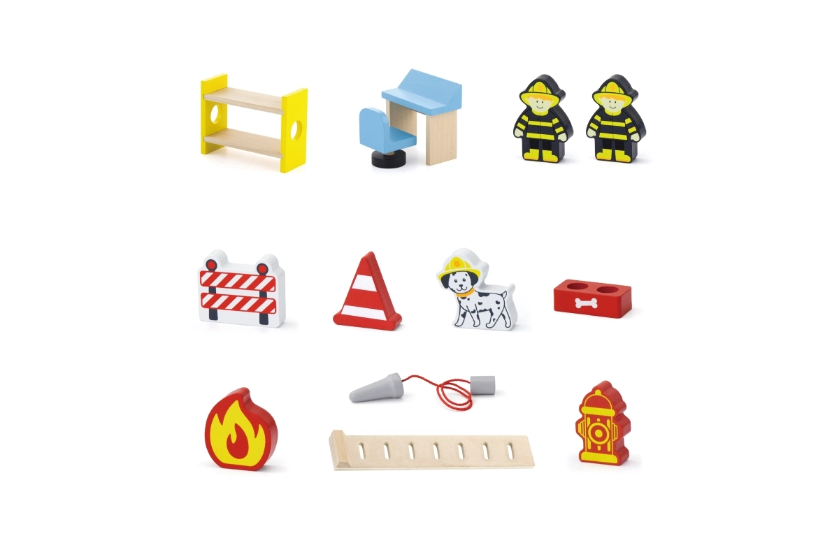 La estación de bomberos de madera Viga es un set de juego completo de varios pisos que fomenta el juego de roles, el desarrollo de la motricidad fina y la imaginación. Los niños pueden salir del garaje con el coche, aterrizar con el helicóptero en la plataforma superior y deslizarse por el tubo directo a la intervención. Los detalles coloridos y la estructura de madera de calidad garantizan un aspecto atractivo y resistencia en el uso diario.