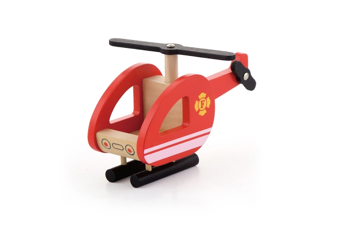 Helicóptero de madera compacto con rotor giratorio y patines estables que complementa cualquier misión de rescate desde el aire.